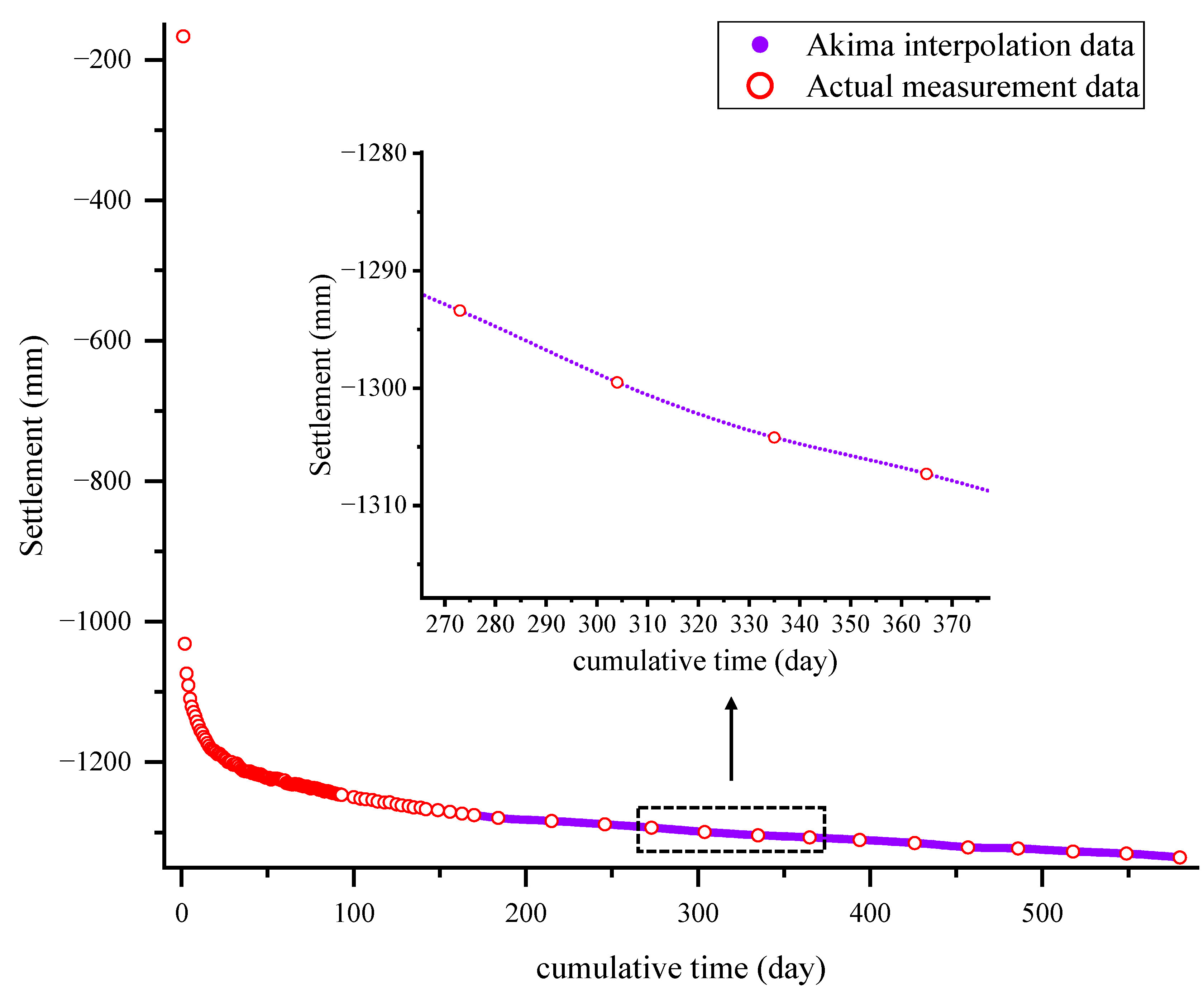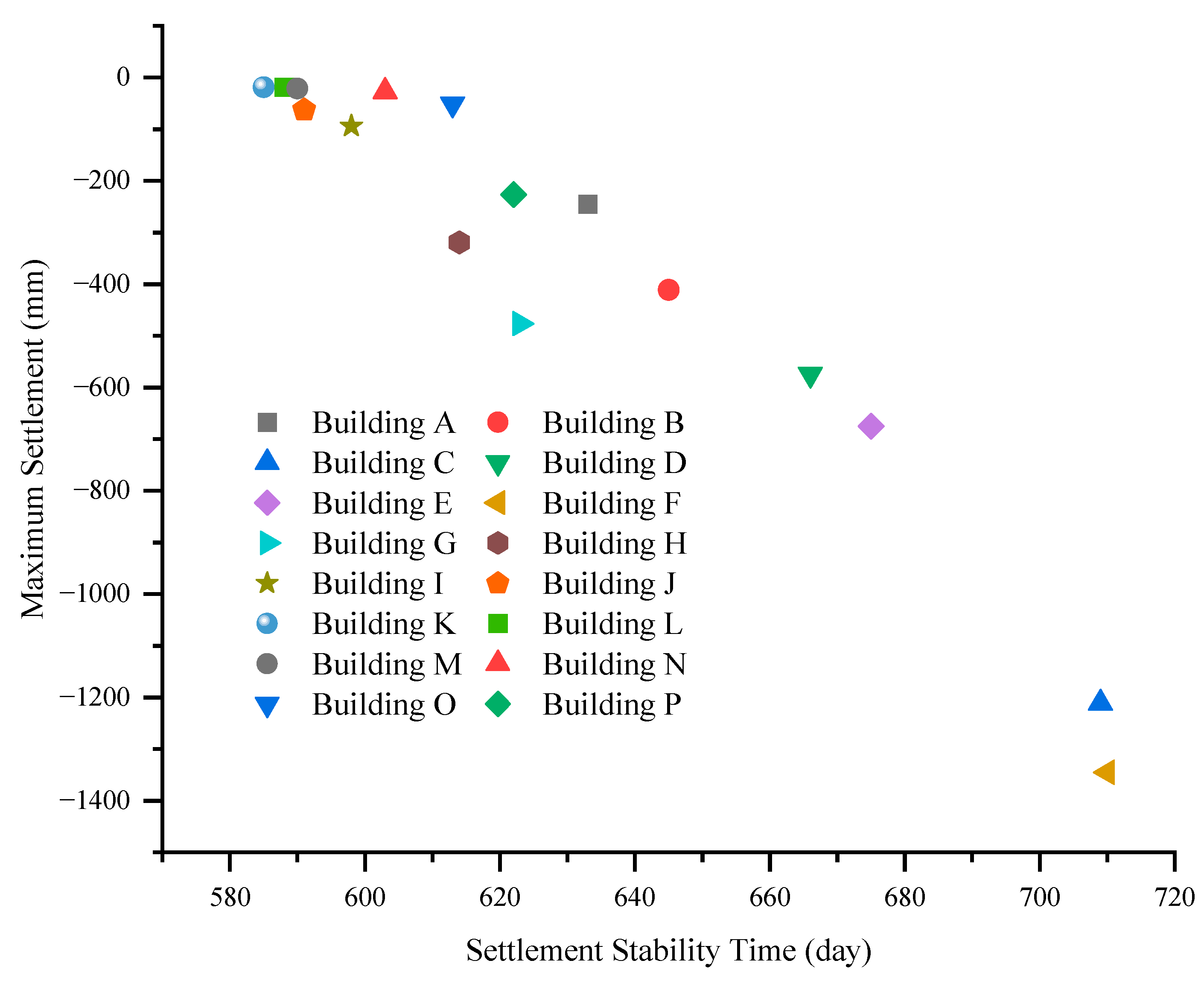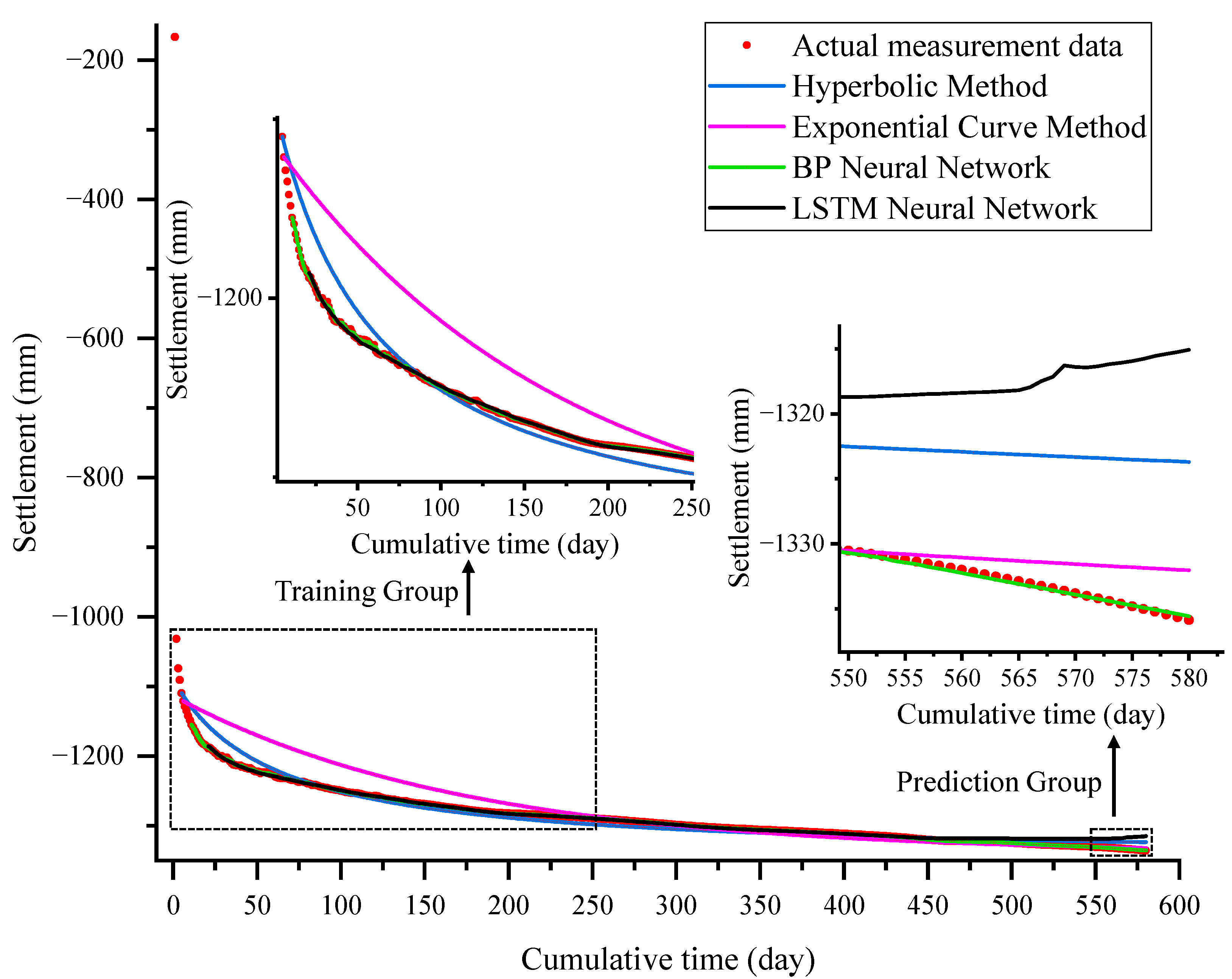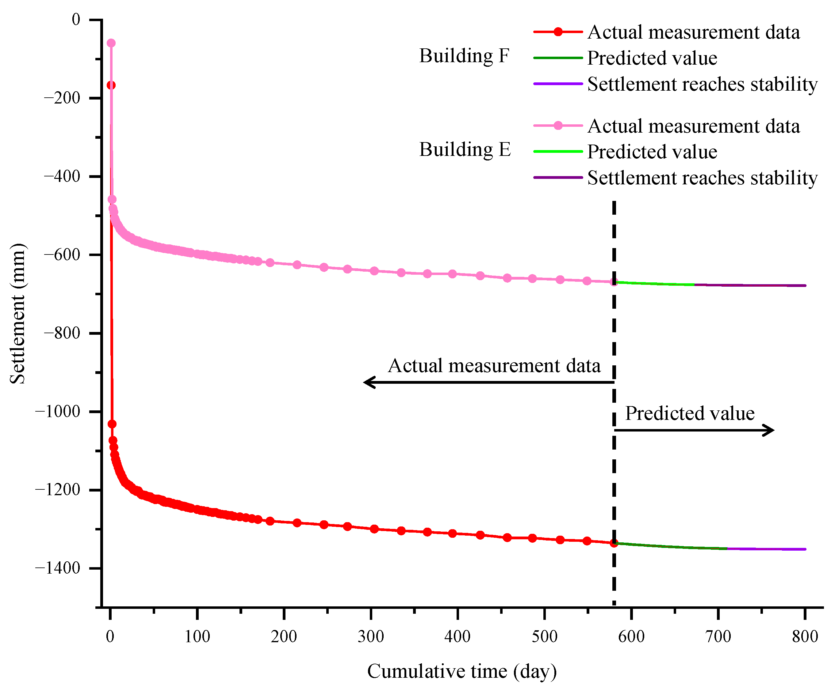 - Zhou, X.; Zhang, Q.; Zeng, Y.; Sun, G. Contrastive Analysis on Exponential Fitting and Hyperbolic Fitting in Settlement Prediction of Soft Foundation. Explor. Eng. 2011, 38, 51–53+58. [Google Scholar]
