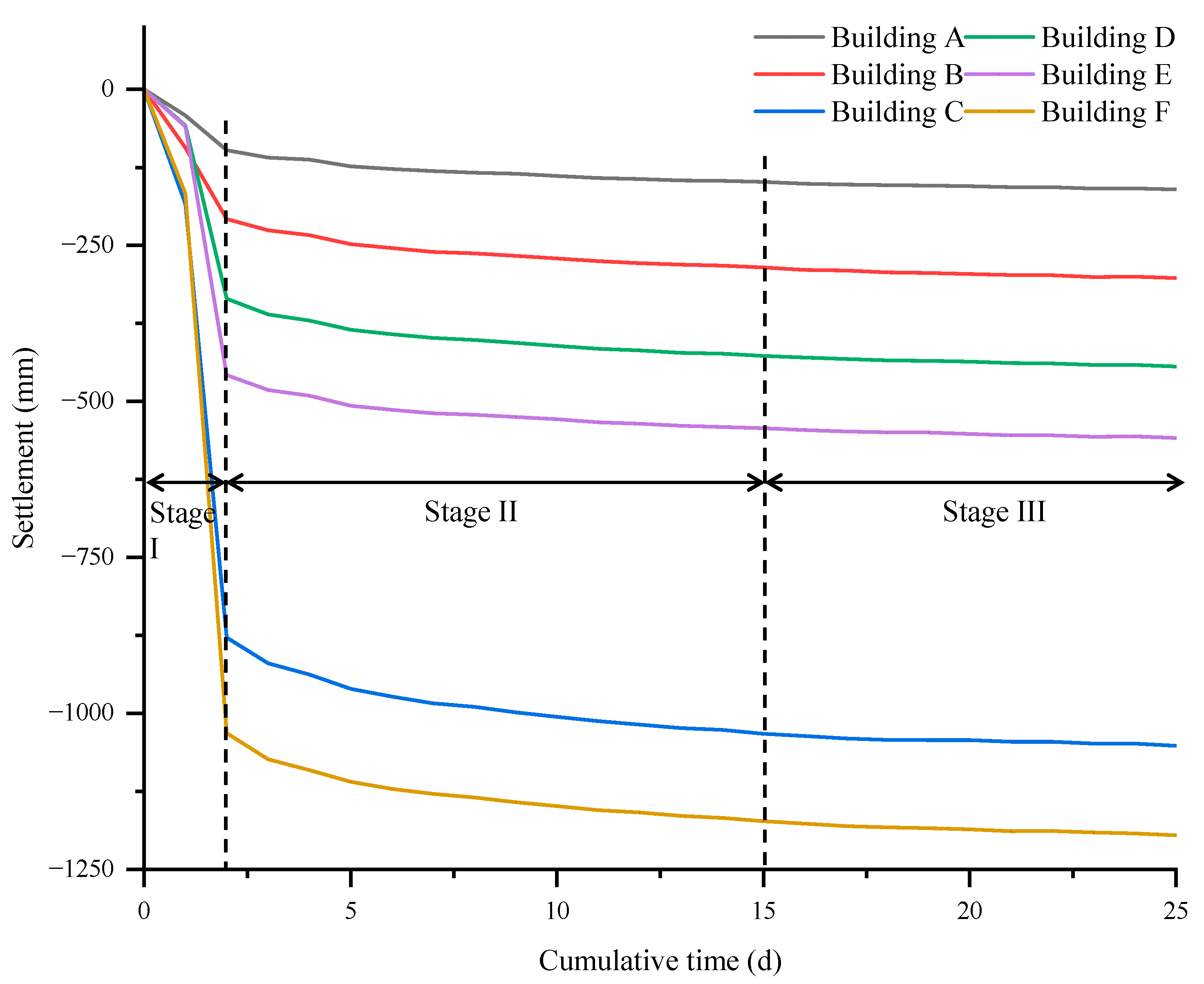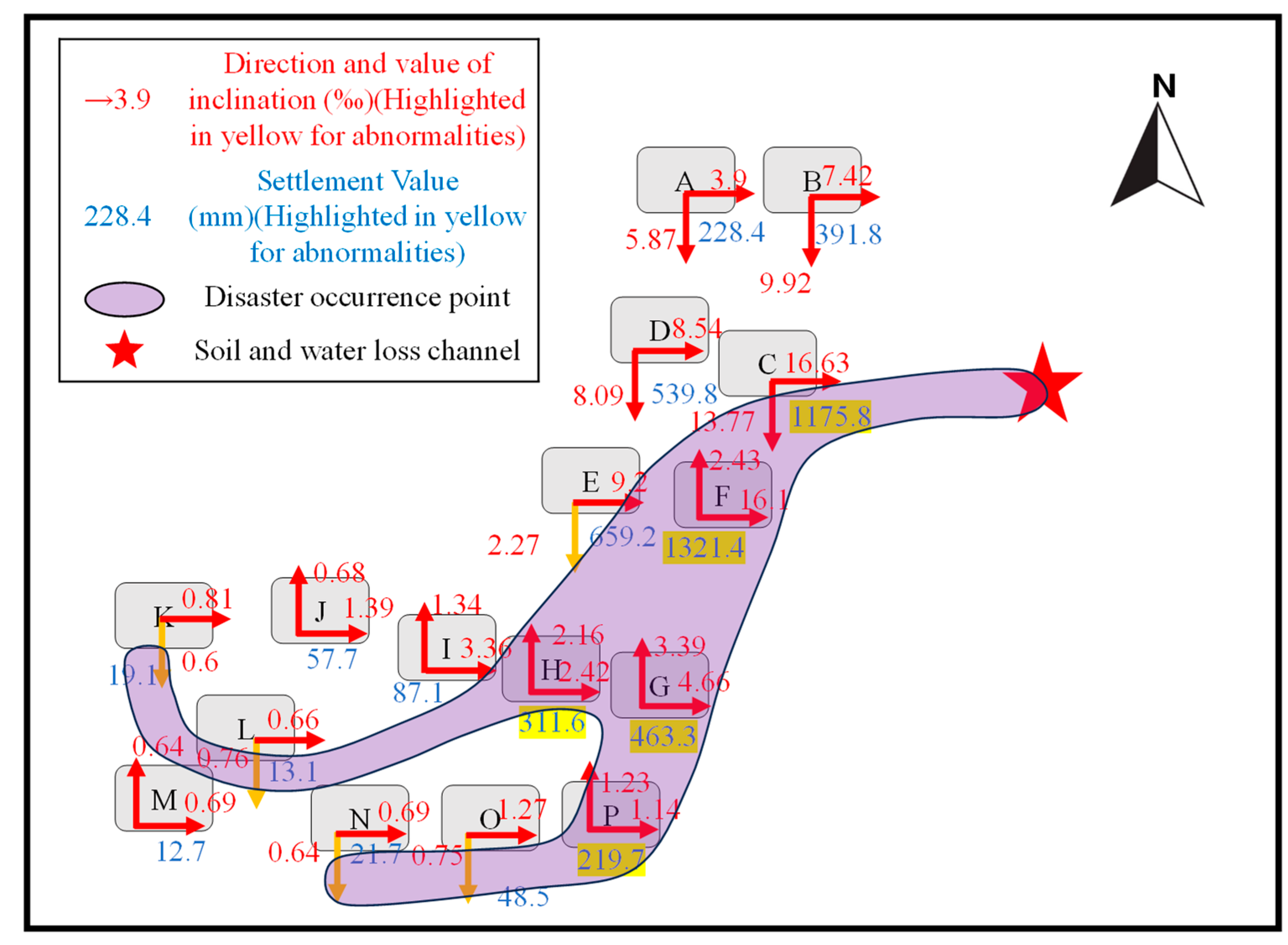 - The building settlements induced by this geological disaster exhibit pronounced temporal staging and spatial heterogeneity. Substantial water–soil loss in the early stage, coupled with the different consolidation rates of sandy and clayey soils in the middle and late stages, jointly produced a three-phase settlement evolution process. In addition, water–soil loss was frequently accompanied by the development of finger-like preferential pathways, which aggravated localized settlement and caused significant spatially differentiated deformation within the building cluster.