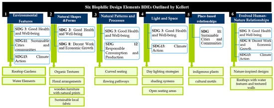Since BDEs in rooftop restaurant interior architecture have been investigated, it is evident that such strategies have a direct relationship with multiple SDGs, thus merging sustainability goals with nature-informed architectural designs. The interior architectural design of rooftop restaurants with BDEs enhances several SDGs by synchronising sustainability goals with nature-inspired design concepts. Thus, it is possible to state that all six elements of BD are linked to the corresponding SDGs, as the style contributes towards the global ultimate goals [].