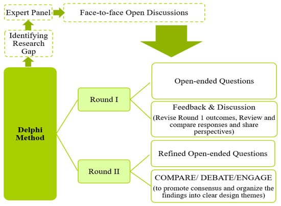 The expert panel engages 15 professionals with practical and academic experience. Through two rounds of face-to-face open discussions, these experts provided comprehensive insights from theoretical, practical, and experiential perspectives, identifying biophilic elements [], determining their application in rooftop restaurant design, and highlighting opportunities and challenges []. This process of experts’ open discussions is a well-established method for gathering in-depth knowledge from experts in the field. The data obtained from this panel contributed to the identification of the most current design and marketing management factors []. The outcomes from the expert panel include the identification and prioritisation of key BDEs, as well as the exploration of challenges and opportunities related to maintenance, cost, and feasibility, with specific reference to creativity and contextual relevance to cultural and geographical locations, ensuring designs are relevant and blend in with the surroundings. See Figure 5, which illustrates the entire Delphi procedure.