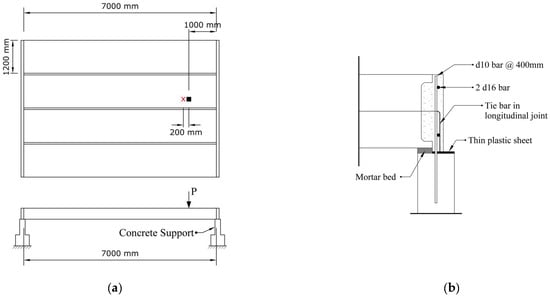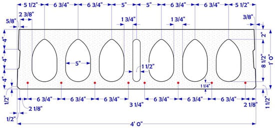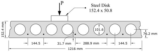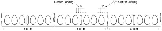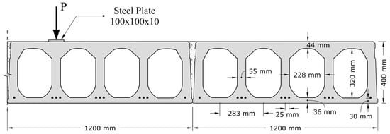 Figure 1 illustrating the Spancrete section used in this study. Individual slabs were connected via cast-in-place concrete longitudinal joints, functioning as shear keys, to form the complete floor system. The longitudinal joint consists of a narrow keyway located between adjacent units. During assembly, this keyway is filled with grout to interlock the units and enable shear transfer across the floor system.