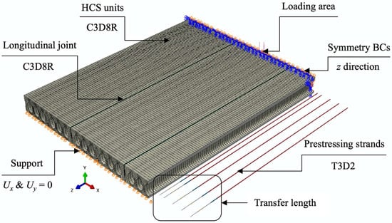 Due to floor symmetry with respect to the mid-span, only one-half of the HCS was modeled. Symmetry boundary conditions were applied along the longitudinal direction (