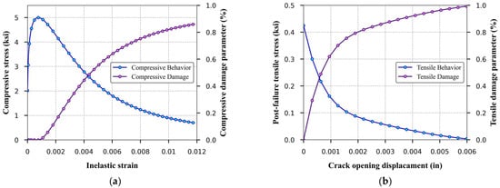 Figure 4a exhibits the uniaxial stress–inelastic strain curve in compression, along with the corresponding compressive damage evolution.