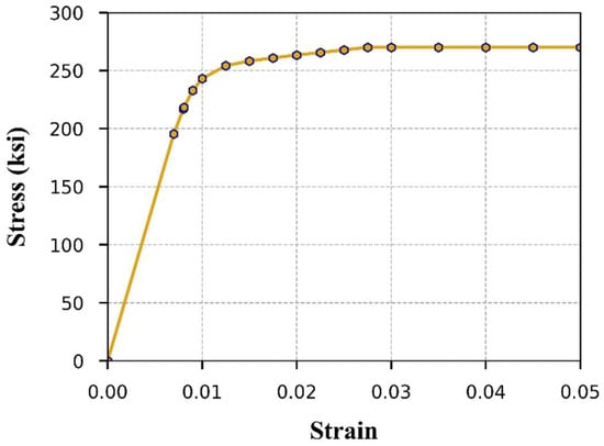 3 (490 pcf). The elastic modulus for the strands was set to 196.5 GPa (28,500 ksi), with a Poisson’s ratio of 0.3 applied in the modeling process. To capture the steel material behavior of the strands, a non-linear elastoplastic model was employed. This model follows the stress–strain relationship proposed by Devalapura and Tadros [