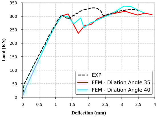 40]. In this study, a broader range from 25° to 40° was initially considered, and sensitivity analysis was performed. The maximum load varied slightly, with less than 6% difference across the range and about 1% between 35° and 40°. This confirms that the model response was not highly sensitive to the dilation angle. A value of 35° was selected, accounting for the self-confinement effect within the HCS floor system due to the placement of adjacent units.