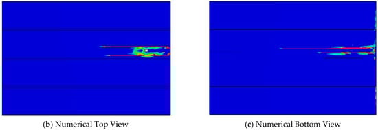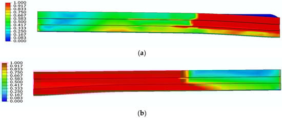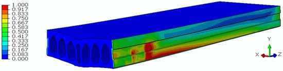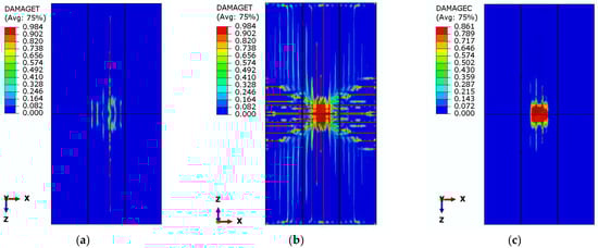 Figure 13b shows extreme damage on the bottom surface around loading area. In the CDP model, these variables evolve between 0 (undamaged) and the maximum value defined by the stress–strain laws in