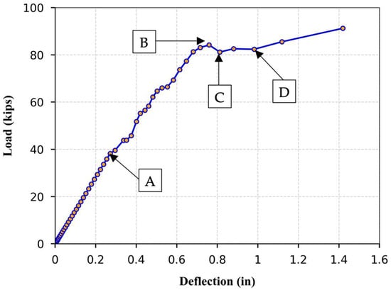 Figure 12. As the load increased, the slab initially exhibited a linear response, reflecting the elastic behavior of the system. The curve starts to deviate from linearity as microcracks formed (A), leading to a gradual increase in the deflection with the continued load. At roughly 169.94 kN (38.20 kips), longitudinal cracks began to form at the midspan on the bottom surface, reducing the stiffness of the slab. With continued loading, these cracks propagated toward the support regions. Upon reaching a load of approximately 374.43 kN (84.18 kips), transverse flexural cracks initiated at the bottom of the middle slab (B). Beyond this peak, the curve plateaued (C), indicating the onset of damage propagation, with additional cracks developing and extending into the side slabs. Subsequently, a longitudinal crack formed (D) and rapidly advanced along the top surface (compression zone) of the slab, resulted in the penetration of the loaded column through the slab depth within the defined loading patch. During column penetration, crushing of the concrete due to the large stresses and strains in all three directions (longitudinal, transverse, and vertical) occurred in the loading area, leading to numerical instability and non-convergence of the analysis.