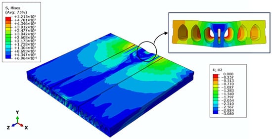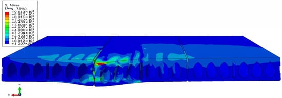 In HCS floor systems subjected to heavy concentrated loads, several failure modes, such as flexural failure, web shear failure, longitudinal joint failure, and punching shear failure, can occur. However, due to the large cavities, HCSs may be more susceptible to punching shear failure under concentrated loads. The lack of reinforcement in the transverse direction increases the risk of this brittle failure mode. This is a localized failure that occurs when shear stresses from loading exceed the slab shear stress capacity around the perimeter of a concentrated load. In this mode for solid flat slabs, a cone-shaped or truncated pyramid-like failure surface forms around the loaded area, as the slab “punches” through. For HCS, this mechanism develops in a different manner and is referred to here as modified punching shear, which is investigated in the following using the analysis results from ABAQUS.