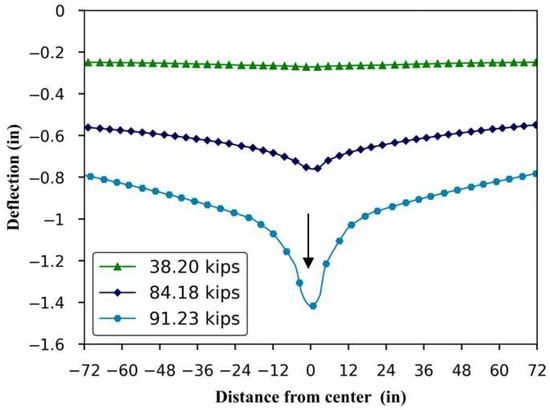 Figure 15. The horizontal axis represents the distance across the width of the slabs from the center. At the cracking load (169.94 kN (38.20 kips)), deflection across the slab is minimal and uniform, reflecting elastic behavior. As the load increases, the deflection becomes more pronounced, suggesting the onset of cracking and reduced stiffness. At failure, the central deflection sharply increases, reaching 35 mm (1.4 in.). The shape of the curve shows that most of the deflection is concentrated in the center, which suggests significant localized deformation, indicating a potential progression toward failure, likely due to modified punching shear and significant cracking in the middle region.