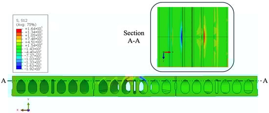 Figure 16 shows the vertical shear stress distribution at the peak load in the HCS. The shear stress pattern started from the periphery of the loaded area and extended downward through the slab, primarily confined to the top flange, with an approximate propagation angle of 45° which is consistent with dispersion angle recommended by EN1168 [