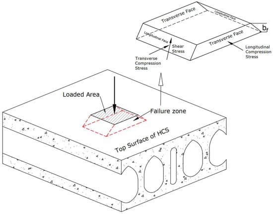 28]. However, unlike the symmetric stress distribution typically observed in punching shear failure of solid slabs, the stress in the HCS is concentrated along two faces, on either side of the loaded area of the top flange, in the longitudinal direction. The observed pattern differs from punching shear in solid reinforced concrete flat slabs in which the shear cracks generally initiate around all faces of the loaded area and radiate outwards diagonally through the entire depth of the slab, forming a truncated cone or pyramid-shaped failure surface around the loaded area as we see in