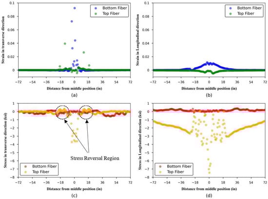 Figure 19. These plots depict the strain and stress values in both transverse and longitudinal directions at the extreme top and bottom concrete fibers across the width and along the span length of the model, respectively. In all these plots, negative values show compression and positive ones show tension.