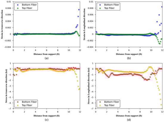 Figure 18c,d reveal that the top fiber experiences pronounced stress concentrations in both transverse and longitudinal directions near the slab center, directly beneath the applied load. These large compressive stresses occur at relatively small strains which in the longitudinal direction are primarily affected by flexure and influenced by Poisson’s effect and transverse bending in the transverse direction. The most significant of these results are the transverse tensile stresses at the top fiber, as well as the reversal of strain and stress patterns, which are characteristic of punching shear behavior. Another insight from these figures is that in the transverse direction, only top and bottom flanges are actively engaged in resisting stresses across the width, whereas along the span, the webs also contribute, allowing for stress redistribution and enhanced load-carrying capacity until failure. This distinction highlights the fact that the HCS is structurally weaker in the transverse direction.