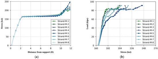 Figure 20a corresponds to the transfer length. Beyond this region, the stress became relatively constant, indicating uniform prestress along the span. The strands were in a state of equilibrium, carrying the applied load evenly, with no significant changes in stress.