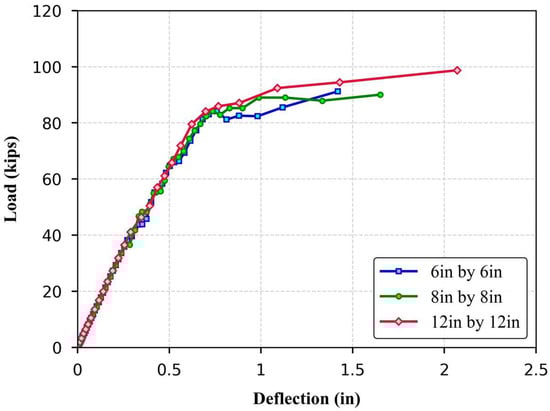 Figure 22. During the initial loading phase, all specimens exhibited a similar linear trend, indicating comparable initial stiffness and elastic behavior regardless of the load area. However, divergence became apparent at higher load levels. The slab subjected to the 203 × 203 mm (8 in × 8 in) load area reached a peak load similar to that of the 152 × 152 mm (6 in × 6 in) patch but exhibited better post-peak performance, suggesting marginal improvements in ductility. In contrast, increasing the load area to 305 × 305 mm (12 in × 12 in) resulted in approximately an 8% increase in ultimate capacity, along with an extended deflection range. The slab continued to carry increasing loads beyond 50 mm (2 in.) of deflection, indicating a more ductile response and enhanced post-peak performance. The observed behavior can be attributed to the distribution of stresses over a wider region in the larger loading areas, which reduces the intensity of localized stresses and delays modified punching shear failure. In the case of the 152 mm (6 in.) loading area, the concentrated stress led to an earlier onset of modified punching shear, limiting both the load capacity and post-peak ductility. Furthermore, increasing the patch size was observed to promote the formation of shear cracks at the supports, suggesting a potential transition in the failure mechanism.