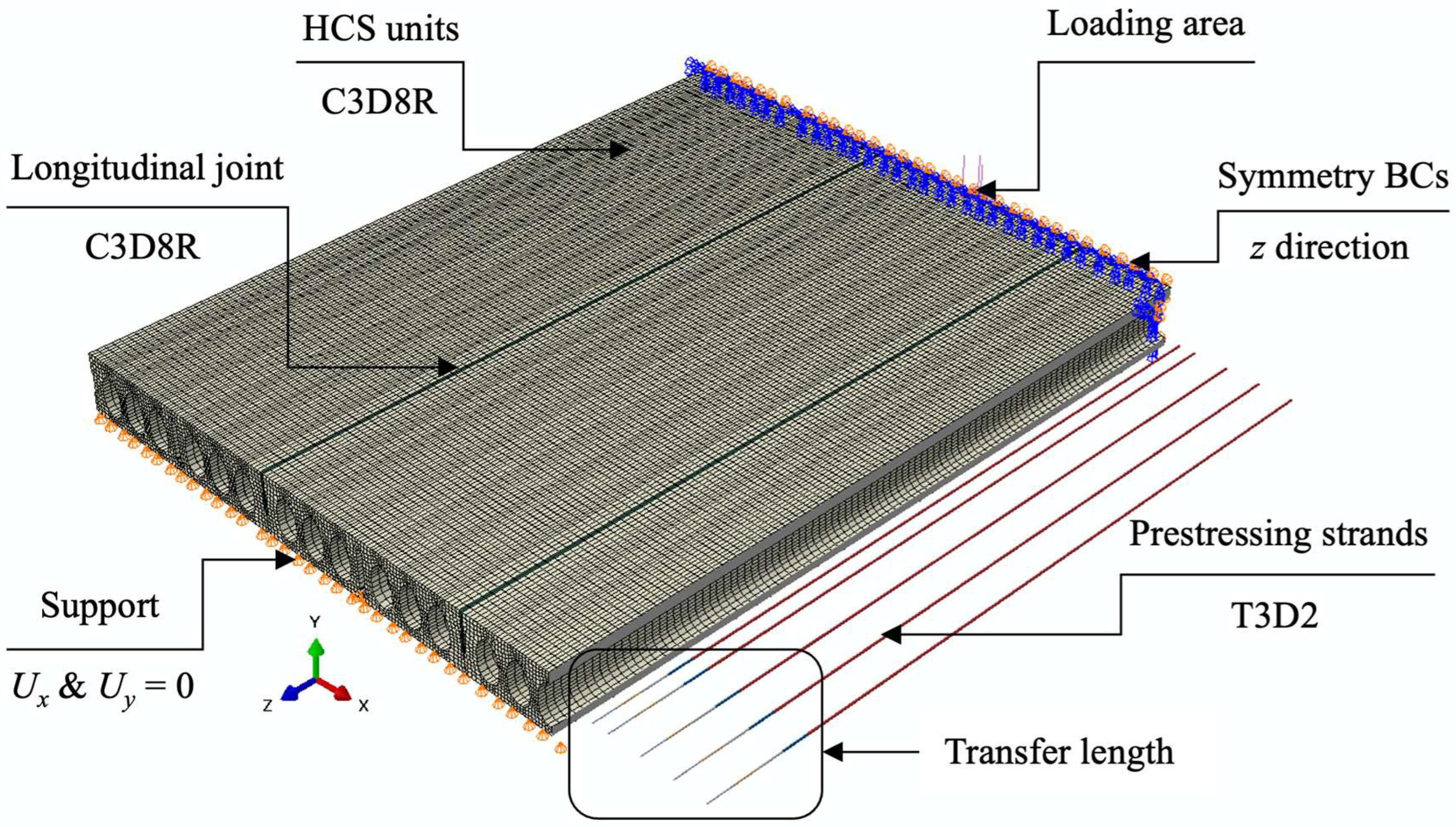 Due to floor symmetry with respect to the mid-span, only one-half of the HCS was modeled. Symmetry boundary conditions were applied along the longitudinal direction (z-axis) on the mid-span surface. The end of the slabs was constrained against vertical and transversal displacement (y and x-axes) along a line spanning the entire width at the support area. The details of elements type and boundary conditions are depicted in Figure 3.