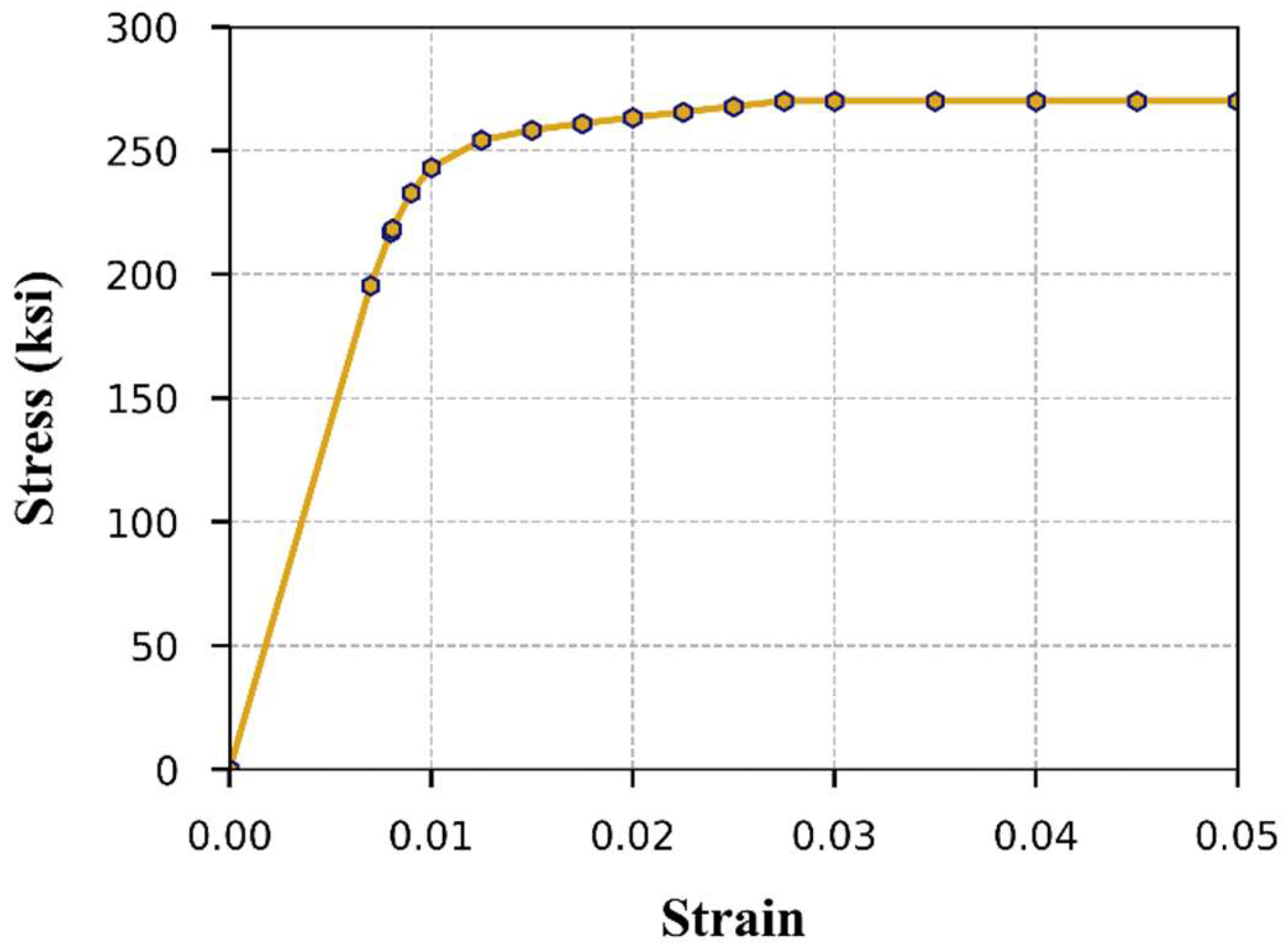 The model incorporated 7-wire low relaxation strands with an ultimate tensile strength of 1860 MPa (270 ksi). The density of steel used for prestressing strands was equal to 7850 kg/m3 (490 pcf). The elastic modulus for the strands was set to 196.5 GPa (28,500 ksi), with a Poisson’s ratio of 0.3 applied in the modeling process. To capture the steel material behavior of the strands, a non-linear elastoplastic model was employed. This model follows the stress–strain relationship proposed by Devalapura and Tadros [45], which refines the power formula originally developed by Skogman et al. [46]. According to ASTM A-416 [47], the minimum yield stress fpy at 1 percent strain for this type of strand should be equal to 0.9 times the ultimate tensile strength fpu. Figure 5 shows the obtained stress–strain response of the prestressing strands chosen for this study.