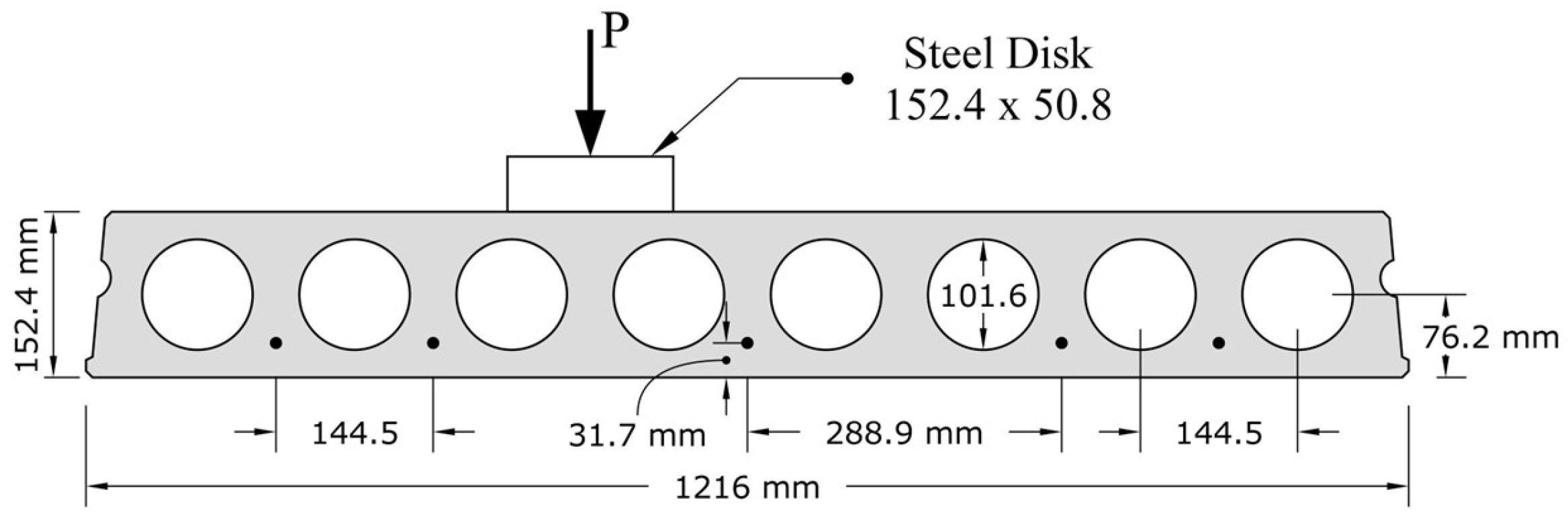 Regarding the testing procedure in McGinnis’s study, the slabs were first subjected to 90-day sustained service loading and then sequentially tested in flexure, shear, and punching shear. Following flexural failure, each slab was repositioned for shear testing on the intact portion, and subsequently for punching on the remaining part. The flexural bending test was conducted over the full slab length, with end supports and two line loads applied symmetrically about the midspan to create a four-point loading condition. For the punching shear test, the slab length was 2134 mm (7 ft), and a concentrated load was applied at midspan on one of the HCS webs, as illustrated in Figure 6.