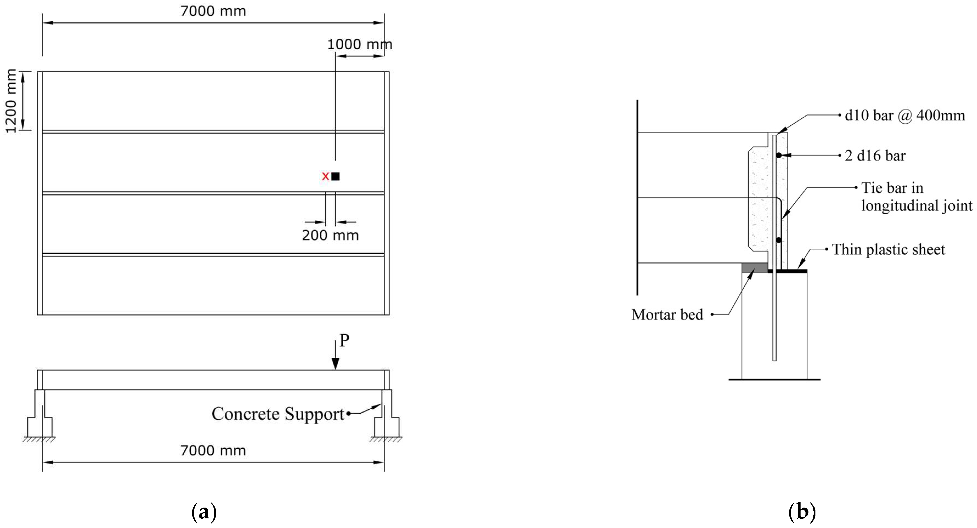 The behavior of a complete floor system composed of multiple interconnected units was investigated using a full-scale experimental test conducted by Pajari [24]. The layout and load configuration of this test setup are presented in Figure 8. The test floor comprised four 400 mm (16 in.)-thick HCS units, each spanning 7 m (23 ft), joined together with the grout and supported by reinforced concrete beams, as illustrated in Figure 9a. A mortar layer was placed between the slabs and the support beams, and a tie beam was cast over the supports, as detailed in Figure 9b. In the FE model, this setup was modeled by restraining the rotational degrees of freedom in the support region to replicate the stiffness provided by the tie beam. L-shaped reinforcement bars were embedded in each joint and to simulate shrinkage-induced cracking, the joints were pre-cracked prior to testing. In the Abaqus model, joint cracking was simulated by assigning zero normal stiffness to specific interfaces between the joints and the slabs. The floor was tested to failure under three different loading configurations. However, only the test involving a single-point load is discussed here, as it is most relevant to the objectives of this study.