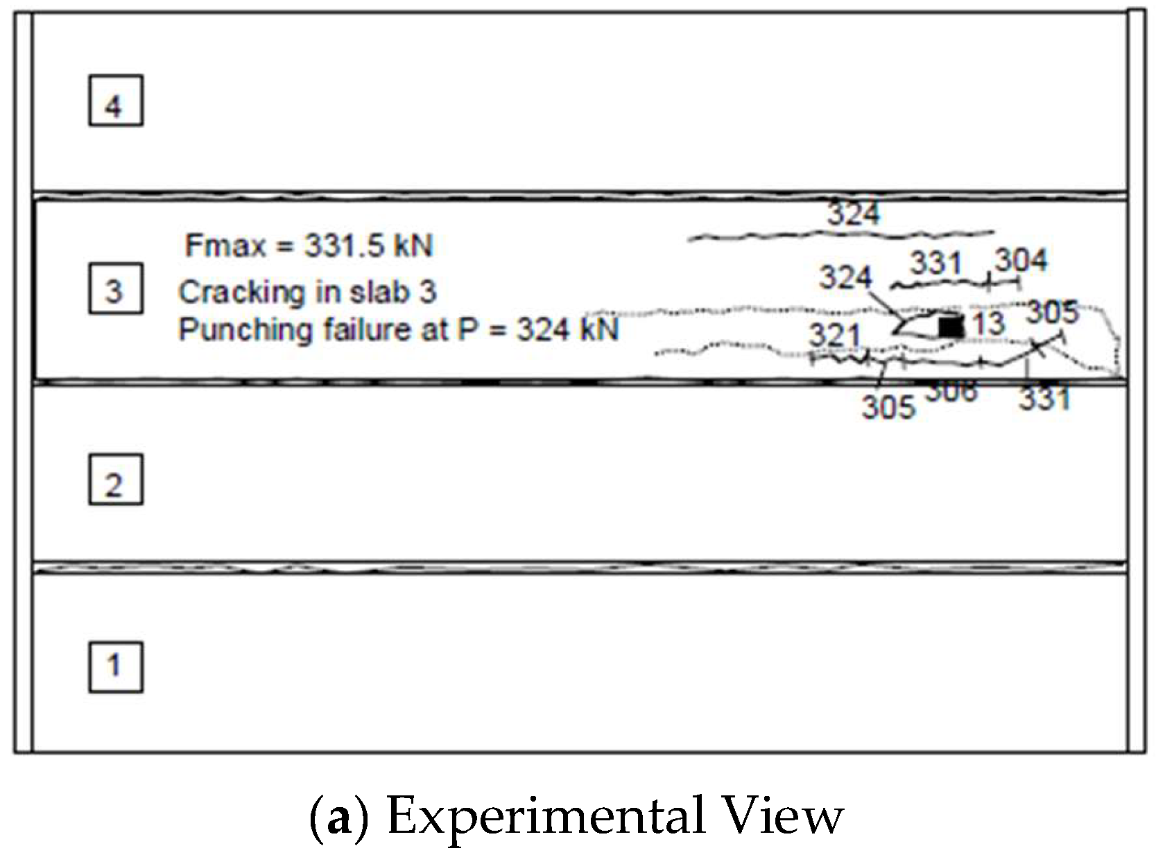 Figure 11. Crack patterns observed in: (a) Experimental test [24] (The solid and dashed lines indicate cracks on the top and bottom surfaces, respectively, and individual slabs are numbered from 1 through 4.), (b) Numerical analysis—top surface, (c) Numerical analysis—bottom surface.