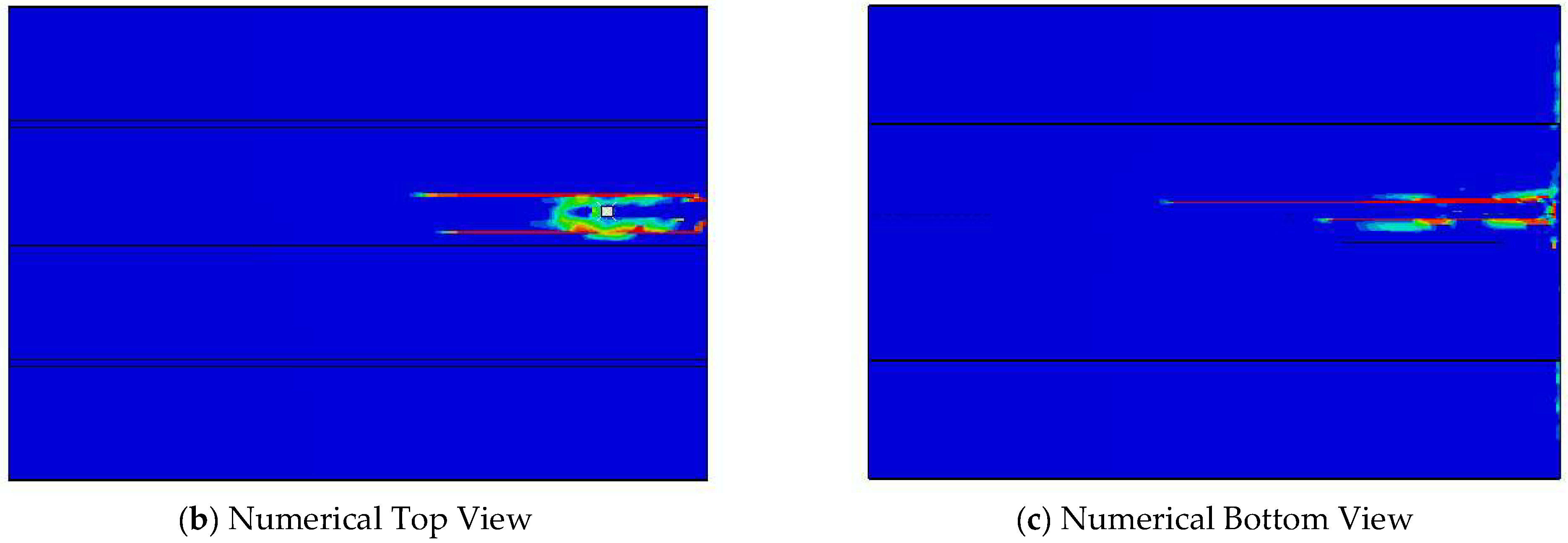 Crack pattern comparison is presented in Figure 11 and shows strong agreement between experimental observations (Figure 11a) and the FE model (Figure 11b,c). Both the top and bottom surfaces exhibited similar longitudinal cracking. However, two minor differences were observed: the long crack located far from the loading point on the top surface in the experiment did not appear in the simulation, and the other two cracks were longer in the FE model. Despite these localized differences, the numerical model demonstrated good predictive capability for crack development, reinforcing the credibility of the simulation methodology.