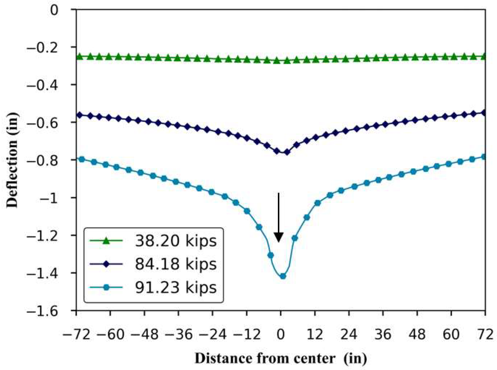 The overall deflection curves of the HCS model at different load levels along a transverse line at the load point are plotted in Figure 15. The horizontal axis represents the distance across the width of the slabs from the center. At the cracking load (169.94 kN (38.20 kips)), deflection across the slab is minimal and uniform, reflecting elastic behavior. As the load increases, the deflection becomes more pronounced, suggesting the onset of cracking and reduced stiffness. At failure, the central deflection sharply increases, reaching 35 mm (1.4 in.). The shape of the curve shows that most of the deflection is concentrated in the center, which suggests significant localized deformation, indicating a potential progression toward failure, likely due to modified punching shear and significant cracking in the middle region.