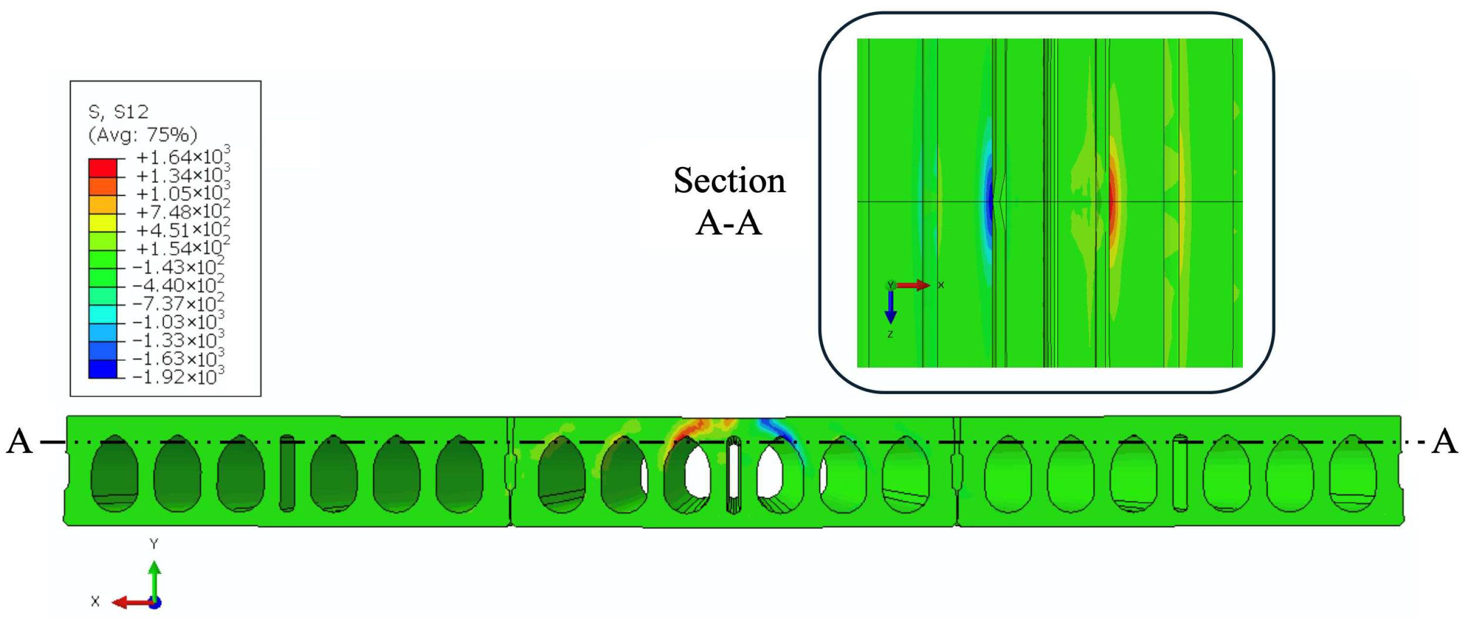 In HCS floor systems subjected to heavy concentrated loads, several failure modes, such as flexural failure, web shear failure, longitudinal joint failure, and punching shear failure, can occur. However, due to the large cavities, HCSs may be more susceptible to punching shear failure under concentrated loads. The lack of reinforcement in the transverse direction increases the risk of this brittle failure mode. This is a localized failure that occurs when shear stresses from loading exceed the slab shear stress capacity around the perimeter of a concentrated load. In this mode for solid flat slabs, a cone-shaped or truncated pyramid-like failure surface forms around the loaded area, as the slab “punches” through. For HCS, this mechanism develops in a different manner and is referred to here as modified punching shear, which is investigated in the following using the analysis results from ABAQUS.