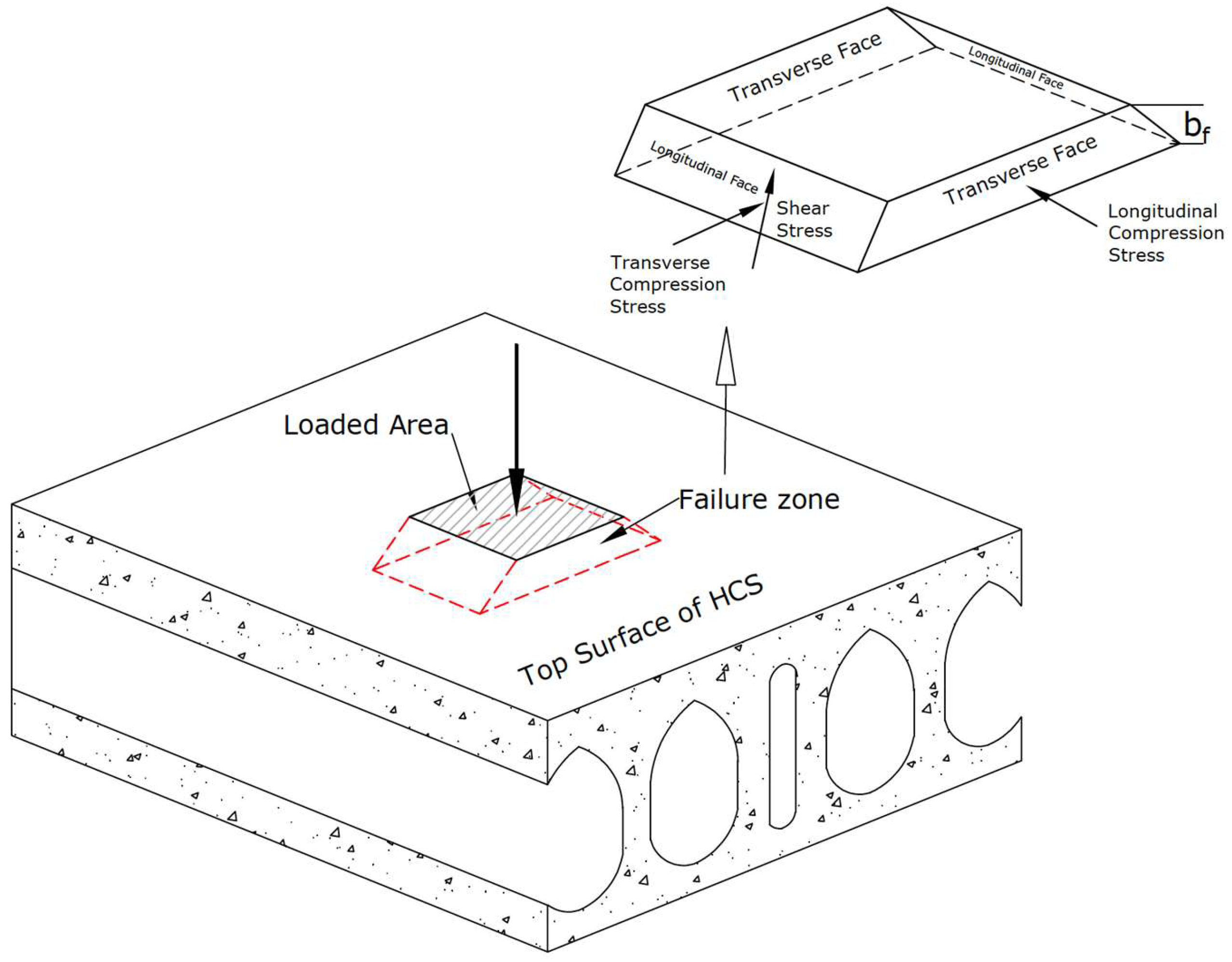 The manufacturing process of HCS restricts the inclusion of shear or other transverse reinforcement, limiting their structural response to rely exclusively on the tensile strength of the concrete. Due to concrete’s inherently low tensile capacity and its complex behavior under concentrated loading, which induces transverse bending moments and localized shear forces, HCS systems appear to be susceptible to punching shear failure, as they are not explicitly configured to resist such effects.