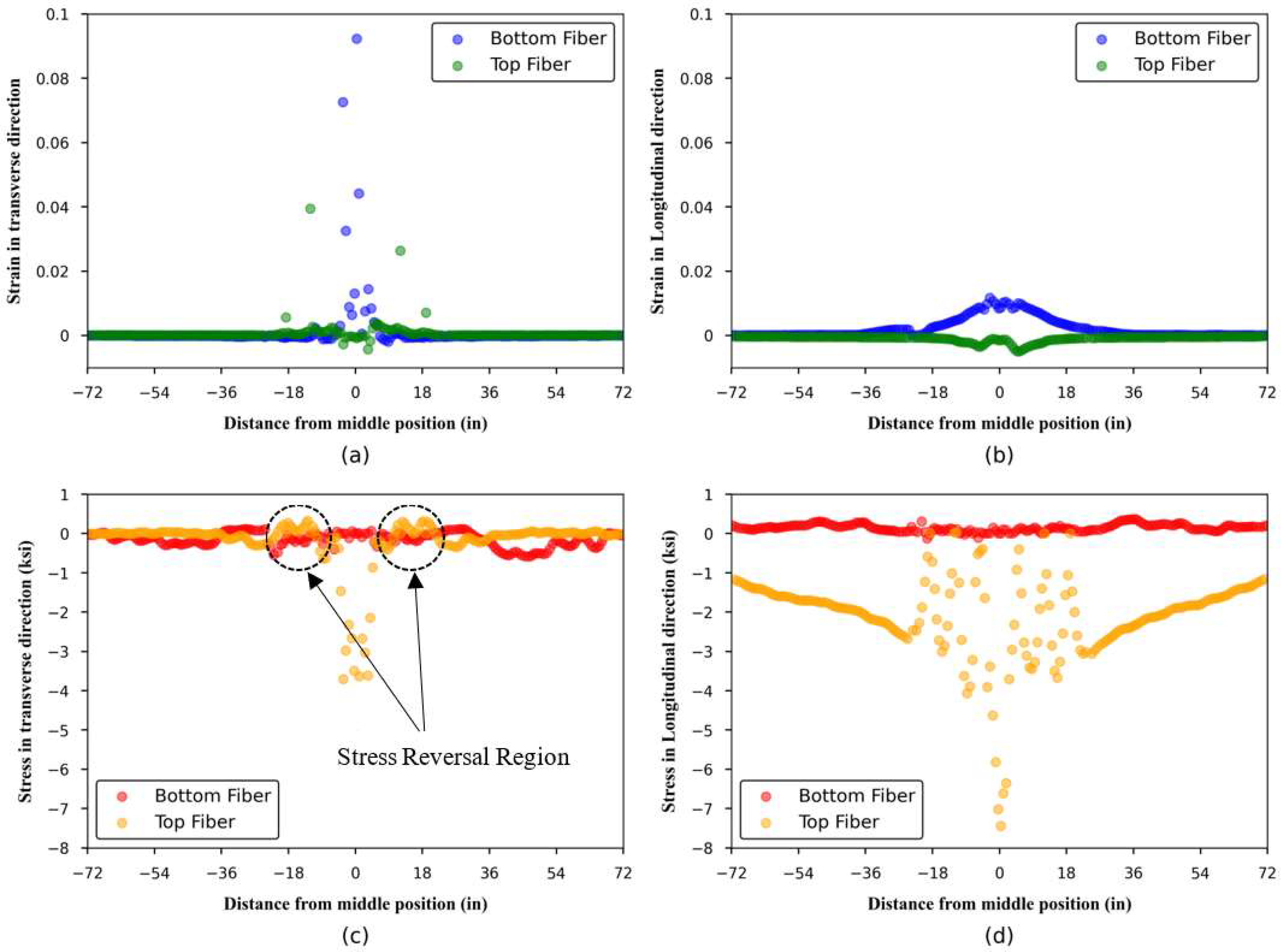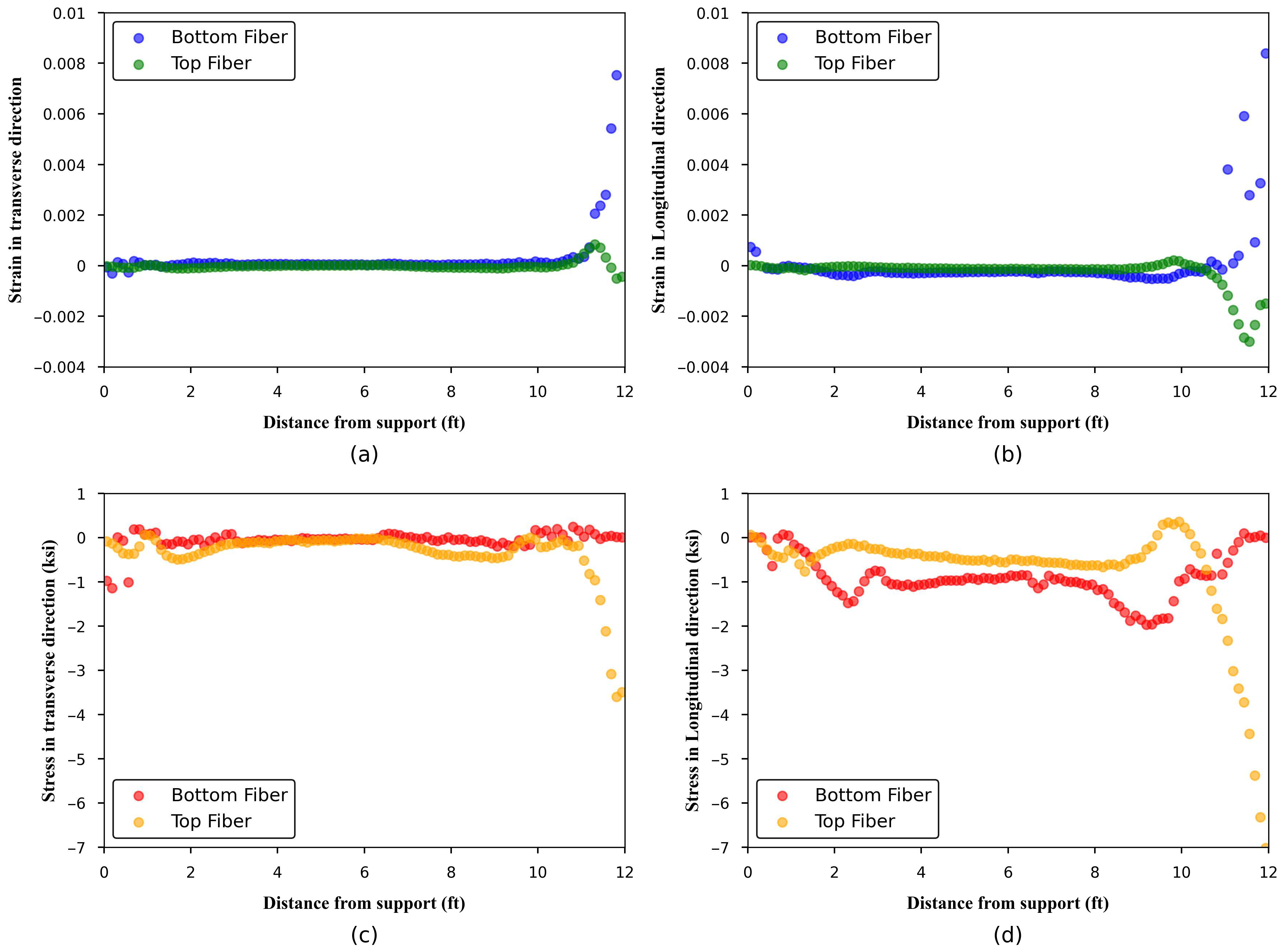 Figure 19. (a) Transverse strain along slab length, (b) Longitudinal strain along slab length, (c) Transverse stress along slab length, (d) Longitudinal stress along slab length. 1 ft = 304.8 mm; 1 ksi = 6.895 MPa.