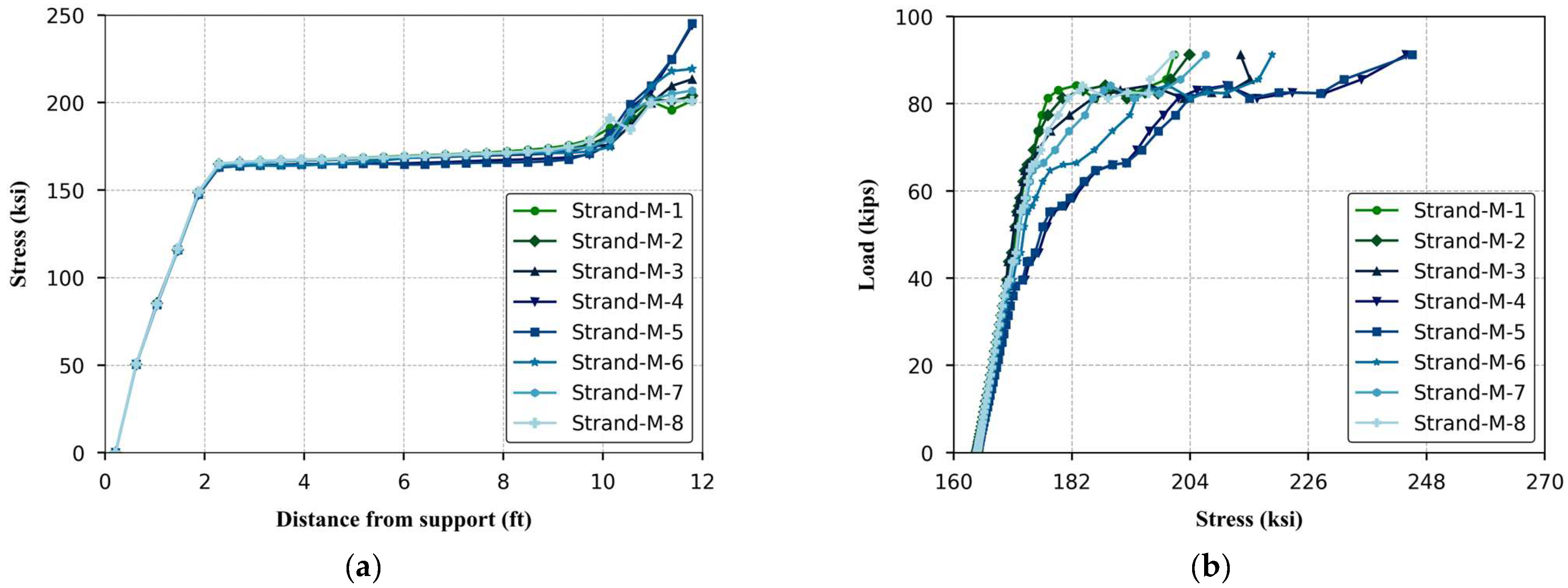 Figure 20. (a) Strands stress response along the span length at failure, (b) Load vs. stress in different strands 1 ft = 304.8 mm; 1 ksi = 6.895 MPa; 1 kip = 4.45 kN.