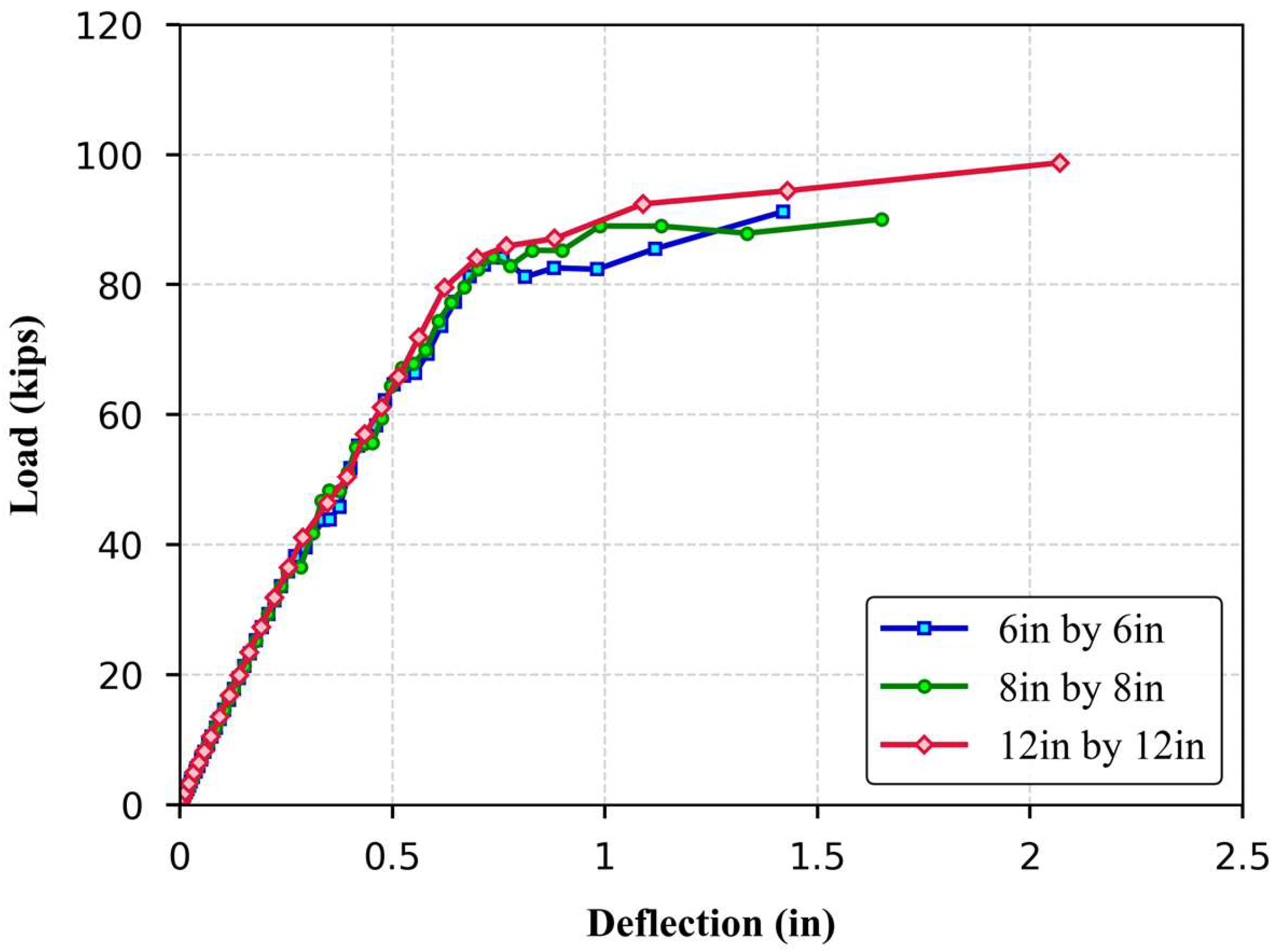 The sensitivity of the HCSs response to various loading areas is illustrated in Figure 22. During the initial loading phase, all specimens exhibited a similar linear trend, indicating comparable initial stiffness and elastic behavior regardless of the load area. However, divergence became apparent at higher load levels. The slab subjected to the 203 × 203 mm (8 in × 8 in) load area reached a peak load similar to that of the 152 × 152 mm (6 in × 6 in) patch but exhibited better post-peak performance, suggesting marginal improvements in ductility. In contrast, increasing the load area to 305 × 305 mm (12 in × 12 in) resulted in approximately an 8% increase in ultimate capacity, along with an extended deflection range. The slab continued to carry increasing loads beyond 50 mm (2 in.) of deflection, indicating a more ductile response and enhanced post-peak performance. The observed behavior can be attributed to the distribution of stresses over a wider region in the larger loading areas, which reduces the intensity of localized stresses and delays modified punching shear failure. In the case of the 152 mm (6 in.) loading area, the concentrated stress led to an earlier onset of modified punching shear, limiting both the load capacity and post-peak ductility. Furthermore, increasing the patch size was observed to promote the formation of shear cracks at the supports, suggesting a potential transition in the failure mechanism.