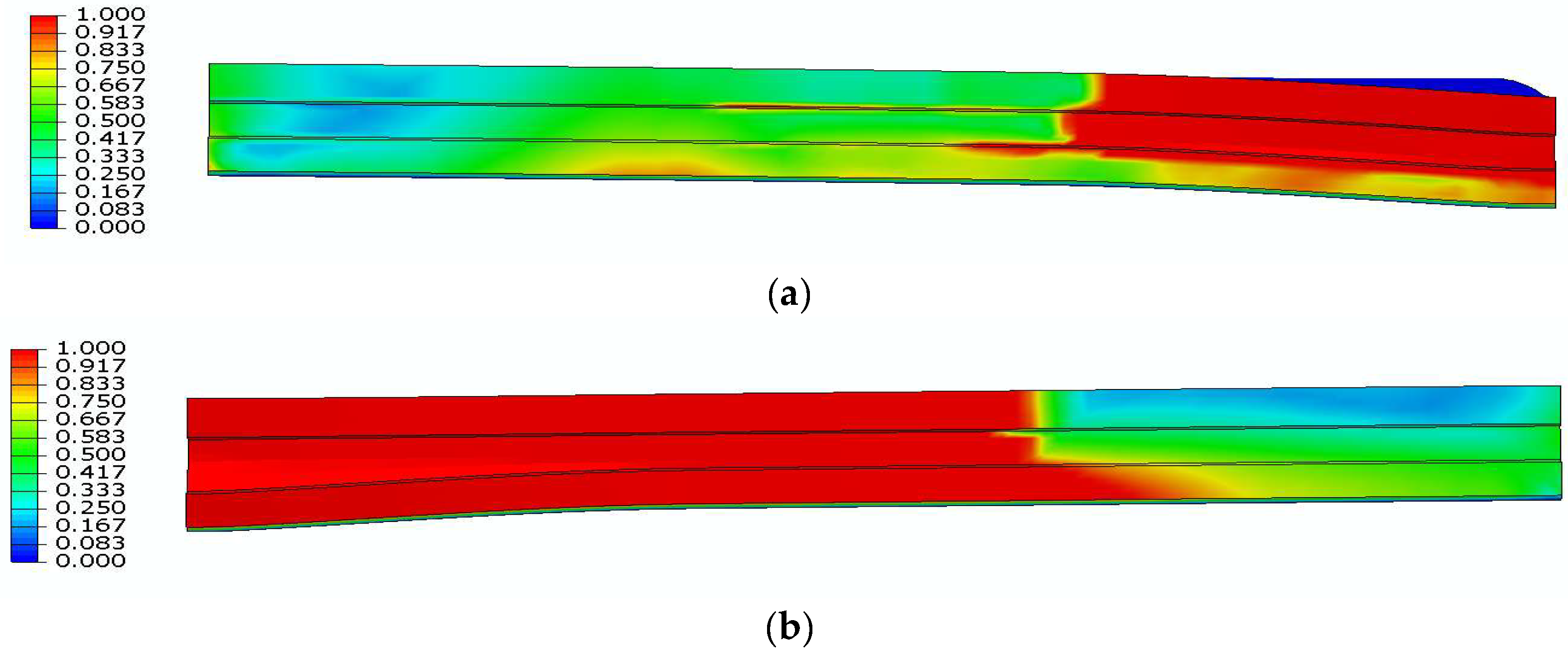 The failure mechanism consists of two components: a damage initiation criterion and a damage evolution law. Prior to damage, cohesive behavior follows a linear traction-separation law. As the bond stiffness progressively degrades, bond failure arises. Damage initiation marks the onset of degradation in the cohesive response at the contact interface. Following damage initiation, the cohesive stiffness undergoes gradual degradation, described by the damage evolution process. This process can be specified using either the total fracture energy or the post-damage initiation effective separation at failure. The scalar damage variable D represents the overall damage at the contact point, evolving from 0 to 1 as loading progresses. This evolution was modeled using a linear softening law based on effective separation. Bond failure in ABAQUS can be tracked using two output variables: the maximum contact stress damage initiation criterion (CSMAXSCRT) and the damage variable for cohesive surfaces (CSDMG). Damage initiation is considered to occur when the first variable reaches a value of 1, and full debonding is assumed to take place when the second variable also reaches unity.