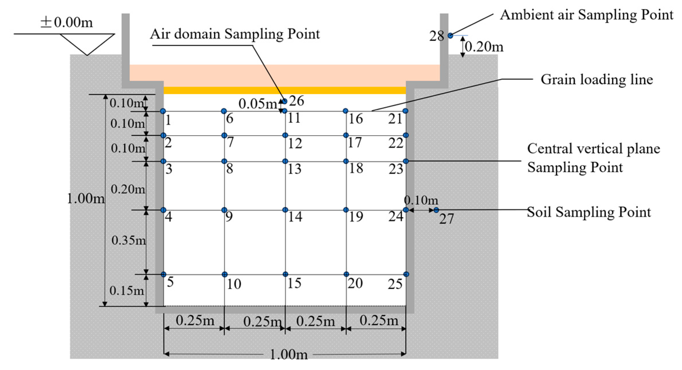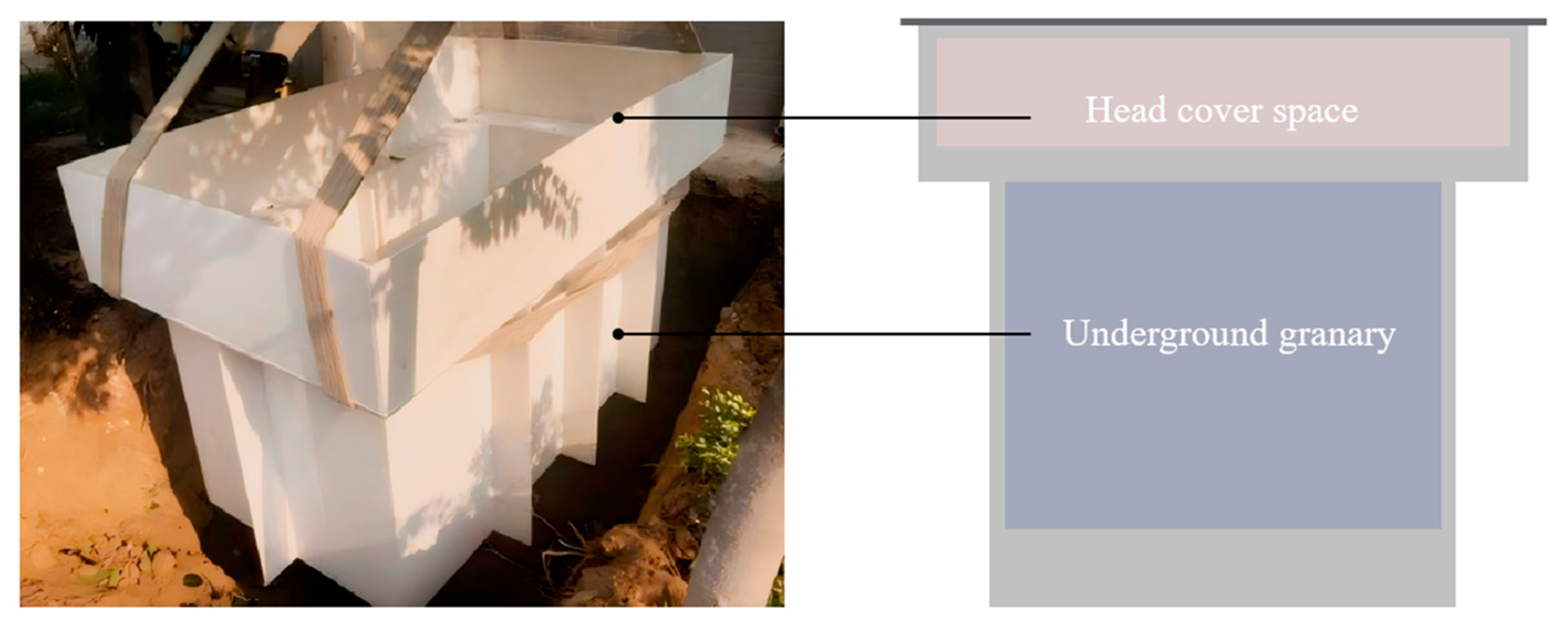 - Jin, L.; Li, C.; Duan, H.; Wang, Z.; Xue, Y.; Wu, Q. On-site test and numerical analysis on temperature field of an underground grain silo under static storage. J. Food Process Eng. 2023, 46, e14306. [Google Scholar] [CrossRef]