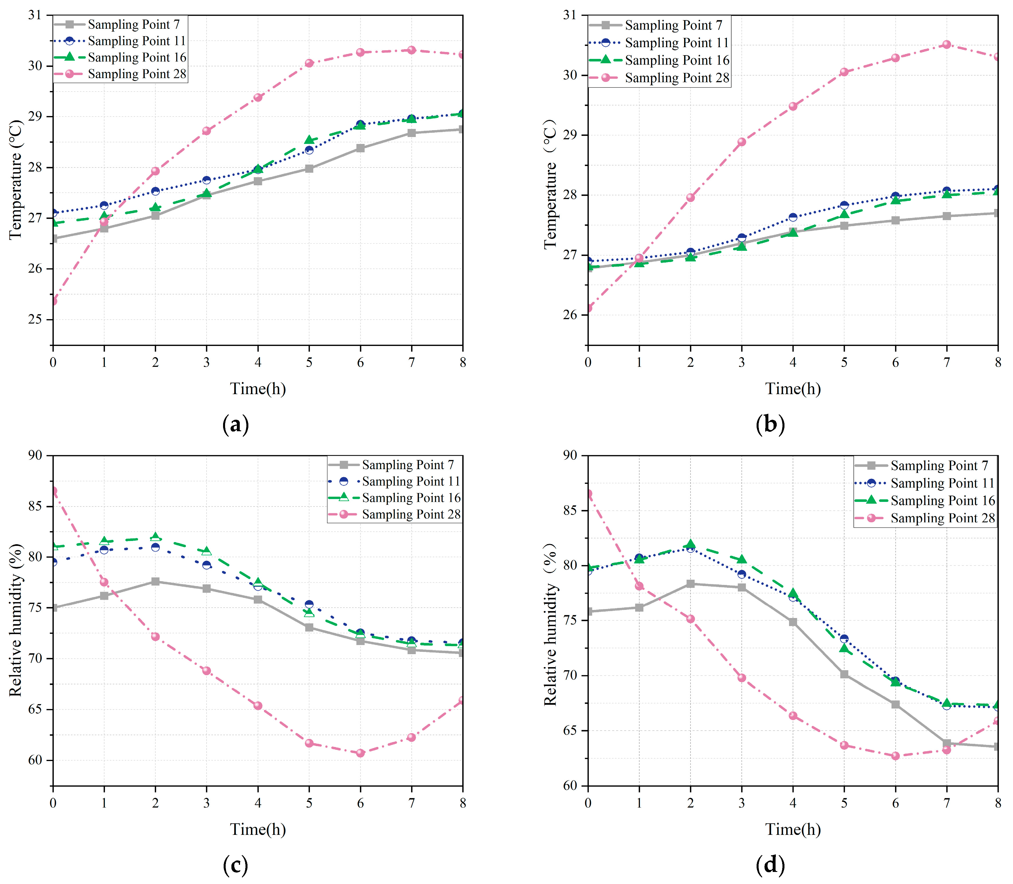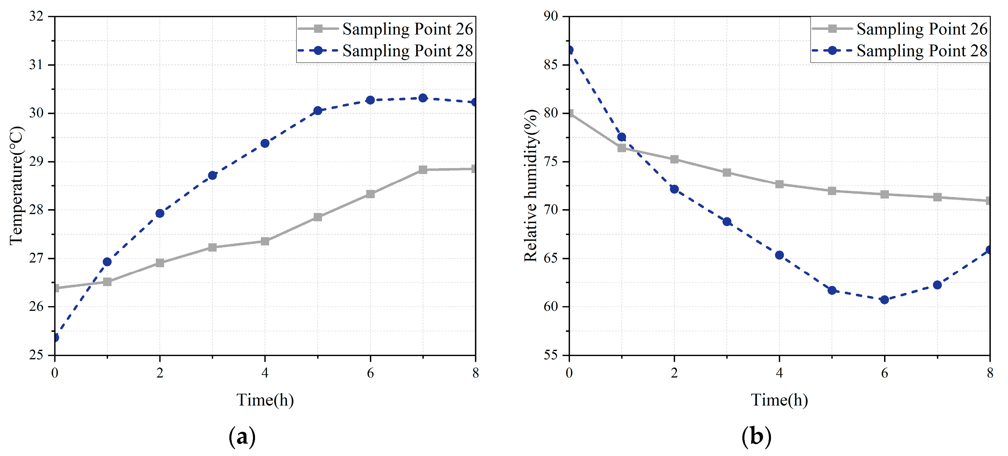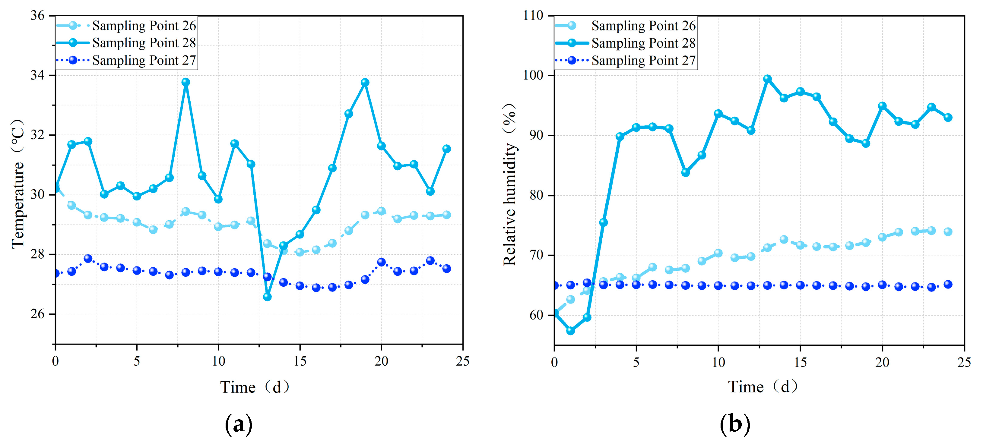 3.3. Effects of Ventilation Strategies on Grain Pile Temperature and Humidity