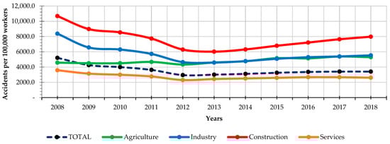 Temporal Evolution of Occupational Accident Incidence Rates Across Economic Sectors in Spain (2009–2018) (Source: Report on the State of Occupational Health and Safety in Spain, 2018 []).