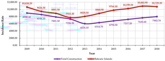 Annual evolution of the incidence rate of occupational accidents in the Balearic Islands, compared to Spanish average for the construction sector; (2009–2018) [].