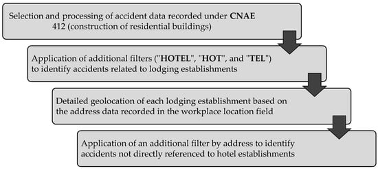 The selection and processing of data focused on accidents recorded under CNAE code 412, corresponding to residential building construction. Within this category, additional filters were applied using the keywords “HOTEL,” “HOT,” and “TEL” to identify potential cases related to lodging establishments. Each record was then geolocated via the workplace address field and verified using Google Maps to confirm whether the site corresponded to a hotel or aparthotel. In cases where the address information indicated a lodging establishment but was incorrectly referenced, accidents were reclassified as public use to correct evident misclassifications. All remaining records were classified as private-use residential construction. This procedure ensured consistent case classification and aligned with the legal and economic distinction between private-use and public-use residential housing in the Balearic Islands, by consistently applying objective and reproducible criteria throughout (Figure 3).