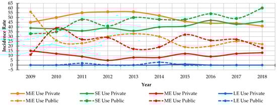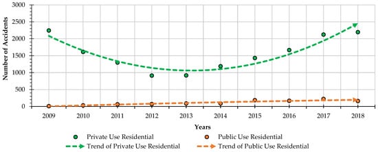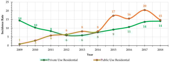 Temporal Evolution of the Occupational Accident Incidence Rate by Residential Construction Typology (Private vs. Public Use), Balearic Island (2009–2018) [].