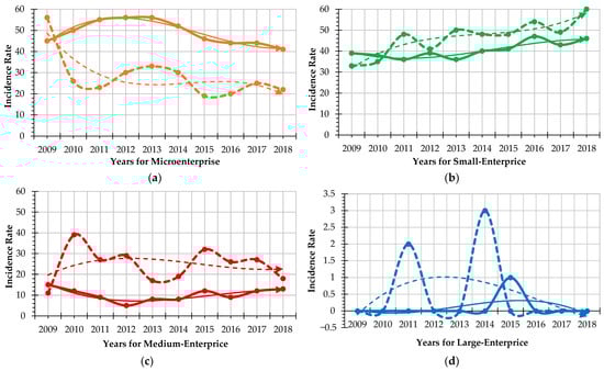 Policymakers can ensure that preventive strategies are effectively tailored to company size and typology by moving away from a “one-size-fits-all” approach and adopting differentiated frameworks. In this study, policy implications in this study refer specifically to regulatory aspects, broader political considerations. As shown in Figure 4, regulatory changes had a significant effect on public-use residential construction, highlighting the need to tailor preventive strategies to the legal frameworks of each sector. These regulatory insights are grounded in empirical data. In fact, the comparison between typologies reveals a reversal in average incidence rates after 2012 (private 9.7 vs. public 12.9 for 2012–2018), a change that corresponds with the timeline of urban-planning reforms outlined in the case study. For microenterprises (MiE), this may involve simplified compliance tools, technical assistance, and targeted inspections that recognize their limited managerial and financial capacity. For small enterprises (SE), policies should prioritize training programs, access to shared prevention services, and mechanisms that strengthen organizational culture, since this group increasingly concentrates accident rates. Medium-sized enterprises (ME) require strategies that promote the institutionalization of safety management systems, while large enterprises (LE), although generally reporting lower accident rates, should be monitored to prevent risk externalization through subcontracting.