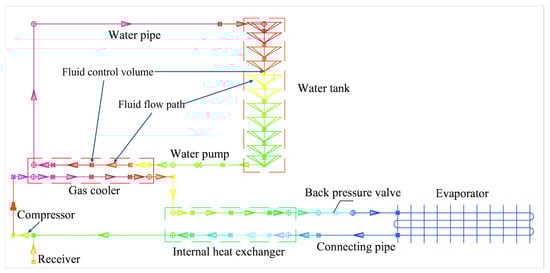 Schematic of the modeled CO2 heat pump fluid system with integrated water loop. For clarity, the number of fluid control volumes is significantly reduced, the details of the evaporator are hidden, and solid control volumes are omitted to simplify the presentation.