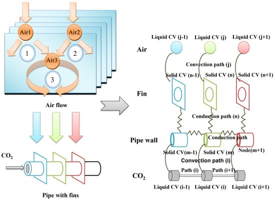 The heat exchanger model, incorporating detailed refrigerant circuitry and air-side flow distribution, was implemented using the resistance–capacitance network framework described in Liang et al. []. In this approach, refrigerant and air streams are discretized into interconnected control volumes, with thermal and hydraulic interactions represented by a network of flow paths and junctions. The geometric configuration of tubes, fins, and headers, as well as the refrigerant circuit arrangement, are explicitly represented, enabling accurate prediction of local temperature, pressure, and phase distribution. The local heat transfer and frictional pressure drop coefficients (Nusselt number Nu and friction factor f) were determined using empirical and semi-empirical correlations summarized in Table 2. The gravitational pressure drop within the heat exchanger was assumed negligible due to the relatively small elevation differences between control volumes. A schematic of the modeled heat exchanger configuration is provided in Figure 2.