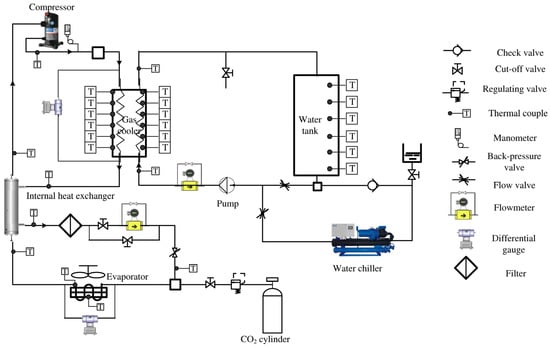 Schematic of the experimental setup. The layout of the experimental system is consistent with the modeling framework but includes additional practical features: (1) temperature, pressure, and flow sensors for real-time monitoring, (2) cut-off valves and bypass piping for maintenance and commissioning, and (3) a secondary water loop equipped with a chiller for scenarios requiring controlled inlet water temperature. Note that the liquid receiver is integrated at the compressor inlet, where it also serves as the vapor–liquid separator.