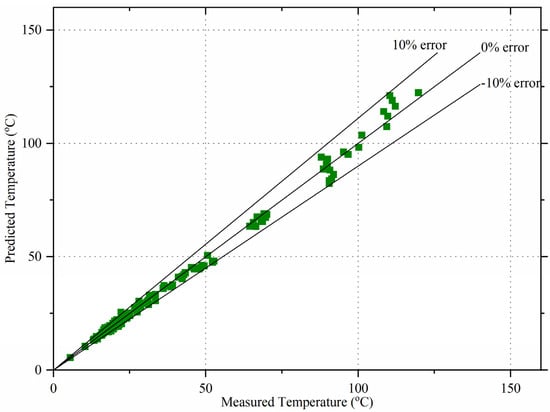 A total of over 160 data points were collected from the experimental tests described above for model validation. Figure 4 compares the predicted temperatures at the inlet and outlet of each component with the corresponding measured values. The results demonstrate that the model accurately reproduces the thermal behavior of the CO2 heat pump system. Overall, the predicted values show good agreement with the experimental measurements, with an average deviation of 3.4% and a maximum deviation of 10.7%. These results confirm that the developed model is reliable for simulating system performance under the tested operating conditions.