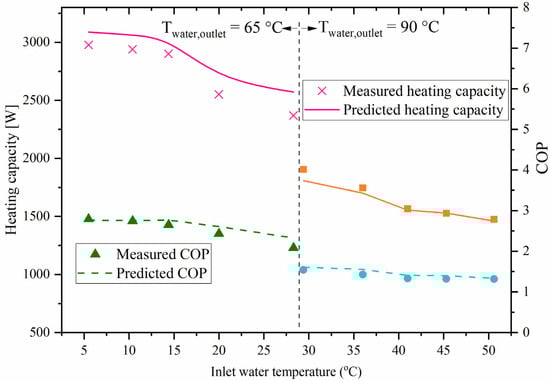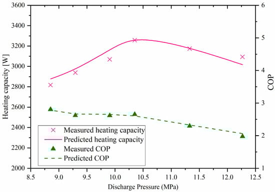 As depicted in Figure 5, both simulation and experimental results reveal a distinct maximum in heating capacity near 10.5 MPa discharge pressure, accompanied by a monotonic decline in COP beyond this point. This behavior can be attributed to the faster rise in compressor power consumption compared to heat output as discharge pressure increases, reducing overall efficiency. Furthermore, Figure 6 shows that increasing the inlet water temperature leads to simultaneous reductions in heating capacity and COP. This trend reflects the diminished temperature gradient between the heat source and sink, which limits heat transfer driving forces and consequently decreases system performance.