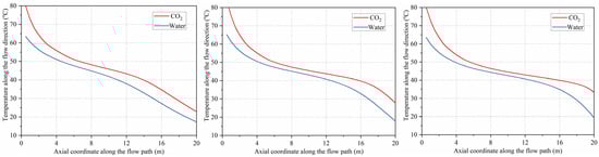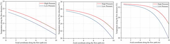 The IHX operates predominantly under subcritical or transcritical conditions, thus exhibiting behavior analogous to a conventional counterflow heat exchanger when operating at low pressures. As illustrated in Figure 7, which presents the temperature difference between CO2 and water at three distinct operating pressures, the minimum temperature difference consistently occurs near the refrigerant inlet or outlet. This pattern arises because the heat transfer coefficient varies monotonically and continuously with refrigerant temperature, resulting in smooth temperature gradients along the exchanger length. As the operating pressure increases, the temperature profiles exhibit reduced linearity, reflecting the nonlinear variation of CO2 thermophysical properties during transcritical processes.