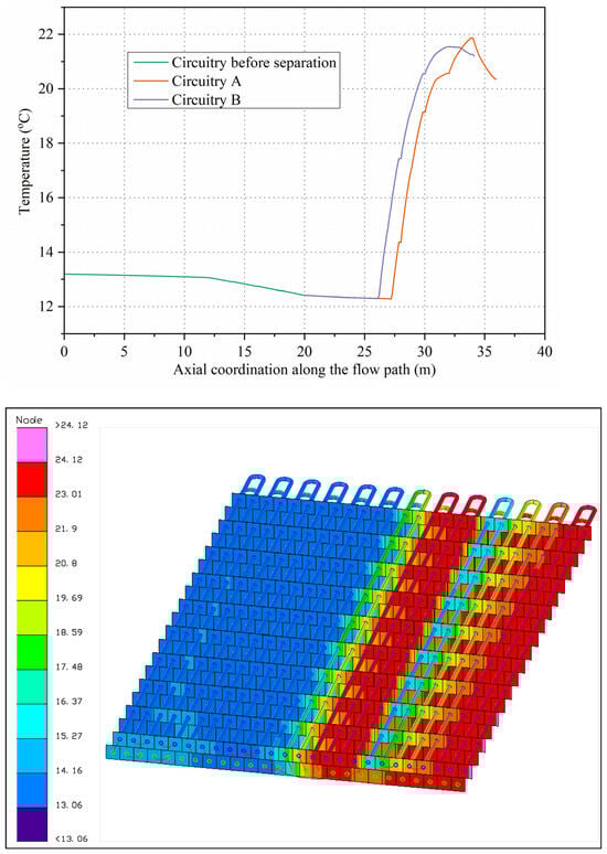 Unlike the general counterflow arrangement in the gas cooler and IHX, the evaporator presents a more complex flow configuration. As shown in Figure 9, the fin-and-tube evaporator studied features one inlet and two outlets. The CO2 temperature exhibits a slight decrease upon entering the evaporator due to pressure drop effects. Following this, the temperature rises sharply as the refrigerant undergoes complete vaporization under single-phase heat transfer conditions. Near the evaporator outlet, a modest temperature decline is observed, attributed to heat short-circuiting within the heat exchanger. This non-monotonic temperature behavior highlights the unique thermal dynamics within the evaporator and underscores the need for detailed modeling to capture such phenomena accurately.