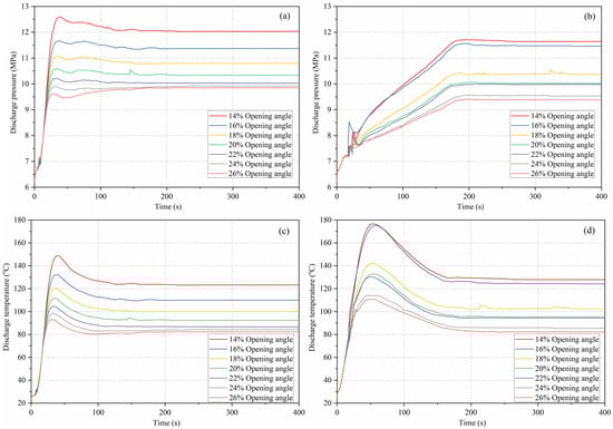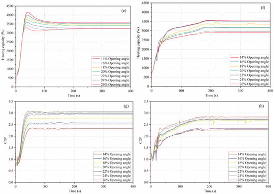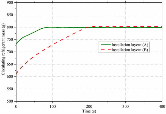 Figure 10 shows the evolution of discharge pressure, discharge temperature, heating capacity, and COP. When the initial refrigerant distribution is the same, varying the back-pressure valve opening produces similar transient trends. However, when the initial refrigerant distribution differs (due to installation layout), the transient profiles change noticeably, even with identical valve openings. In general, discharge pressure, heating capacity, and COP rise more steeply in layout (A) than in layout (B), owing to the smaller amount of circulating refrigerant in the latter case (see Figure 11).
