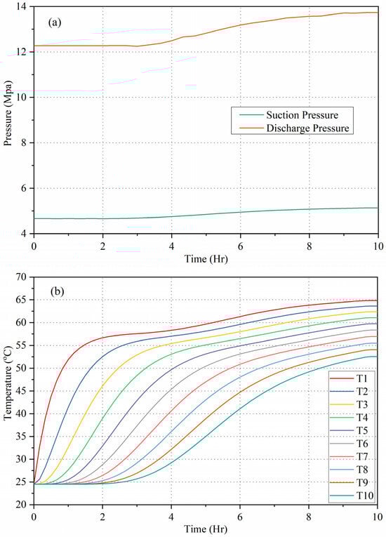The developed model was applied to simulate the water heating process over an extended duration of up to 10 h in order to capture the long-term thermal and operational behavior of the CO2 heat pump water heater. Figure 12 presents the time evolution of the system pressures and the water temperature distribution in the storage tank. As observed from the simulation results, both the discharge pressure and the suction pressure increased by ~10% during the heating period. This gradual pressure rise can be attributed primarily to the elevated temperature of the heat sink as the water temperature in the tank increased, which in turn altered the thermodynamic state of the refrigerant throughout the cycle.