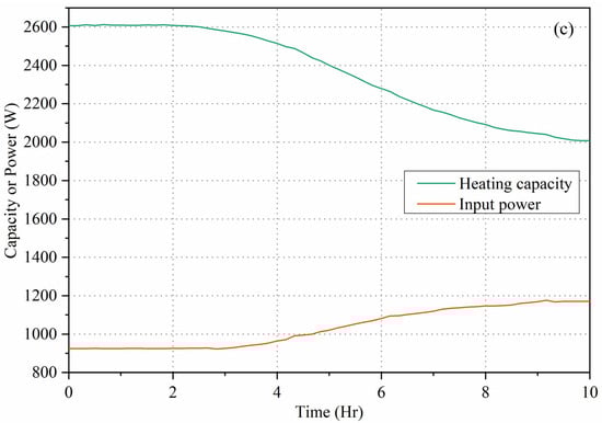 The electrical power input to the compressor exhibited a steady upward trend over the course of the heating period, increasing from an initial value of ~920 W to about 1170 W at the end of the ten-hour simulation. This rise in electrical consumption is consistent with the increased compression work required at higher condensing pressures, which occur as the heat sink temperature rises. Meanwhile, the heating capacity of the system exhibited a gradual decline with time. This reduction is primarily due to the decreasing water temperature difference between the inlet and outlet of the gas cooler. As the water temperature approaches the desired setpoint, the incremental heat gained by the tank diminishes, and the instantaneous heating rate naturally declines.
