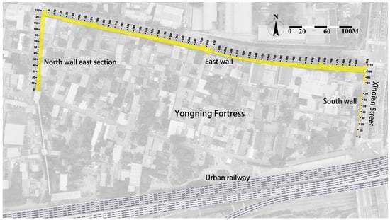 This study conducted systematic surveys of herbaceous vegetation on the remaining wall structures of Yongning Fortress, specifically targeting the eastern section of the northern wall, the eastern wall, and the southern wall remnants as shown in Figure 1, with particular focus on distribution patterns along the exterior facades. The field survey was executed in late April 2024 to coincide with the early growth stage of various herbaceous species, optimizing documentation of plant community composition. Using the standard transect survey method, the ramparts were divided into 10 m segments as independent survey units. Species identification was performed through on-site morphological examination supplemented by authoritative references such as Flora of China. Detailed records were made of the dominant species and their distribution patterns within each segment.